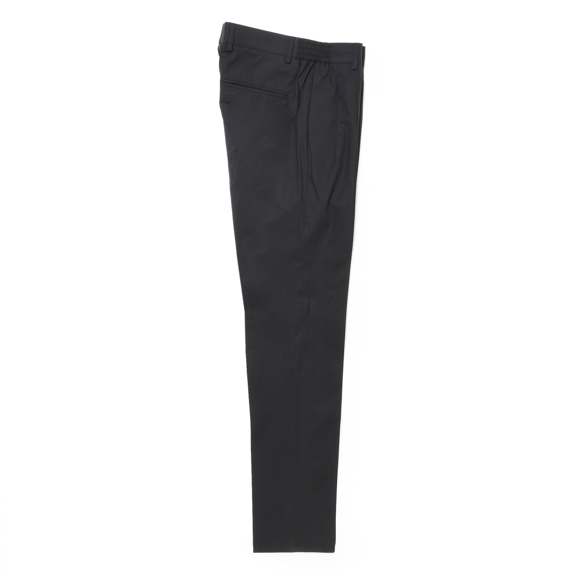 ・両サイドウエストの一部分がゴムシャーリングになることで腰廻りに沿う心地良いフィット感を実現しています。ベルトループが付属しているのは本格派トラウザースブランドの証。