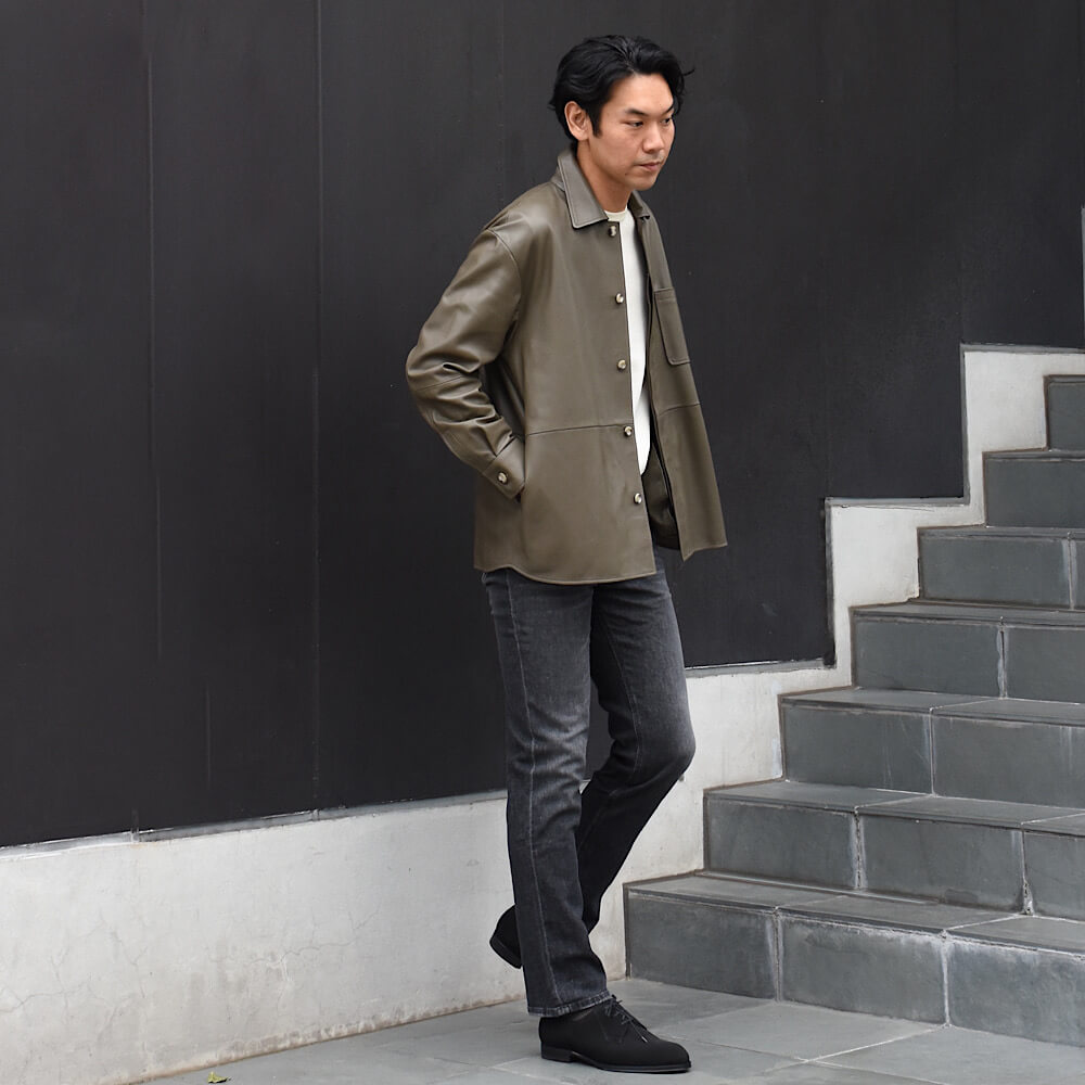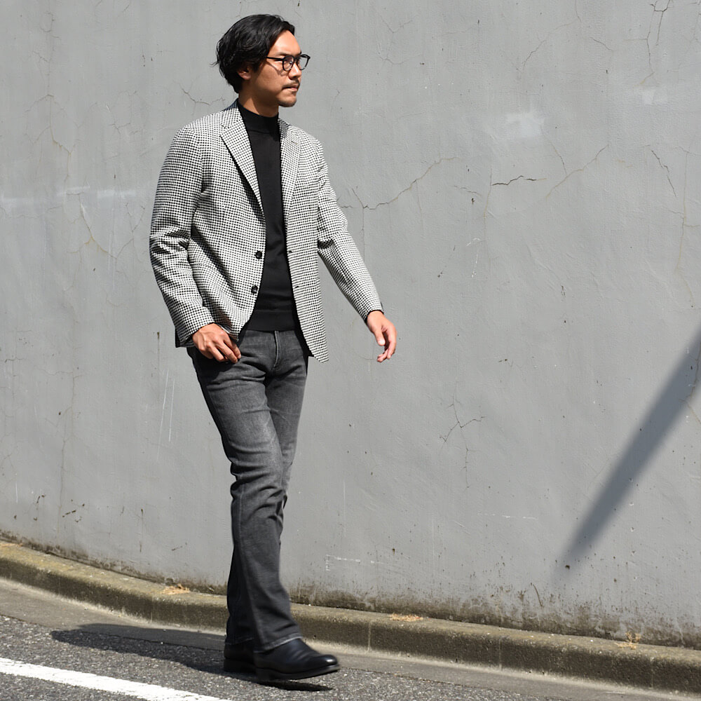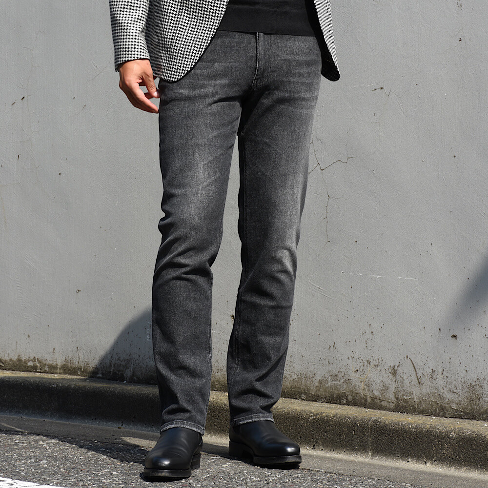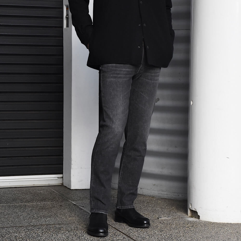 ・生地は12オンスのブラックデニムをミディアムウォッシュし、軽めの加工を入れることでこなれ感を加えたもの。色合いと加工具合にやり過ぎ感がなく、年齢問わず取り入れやすい仕上がりです。