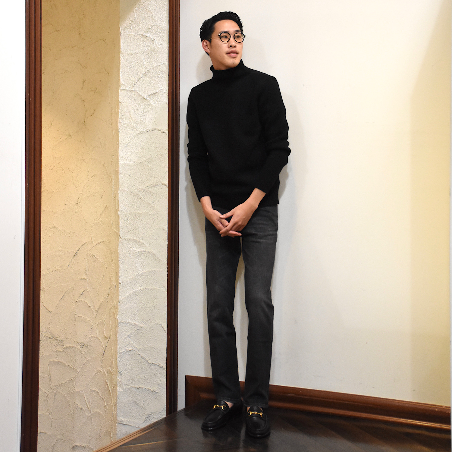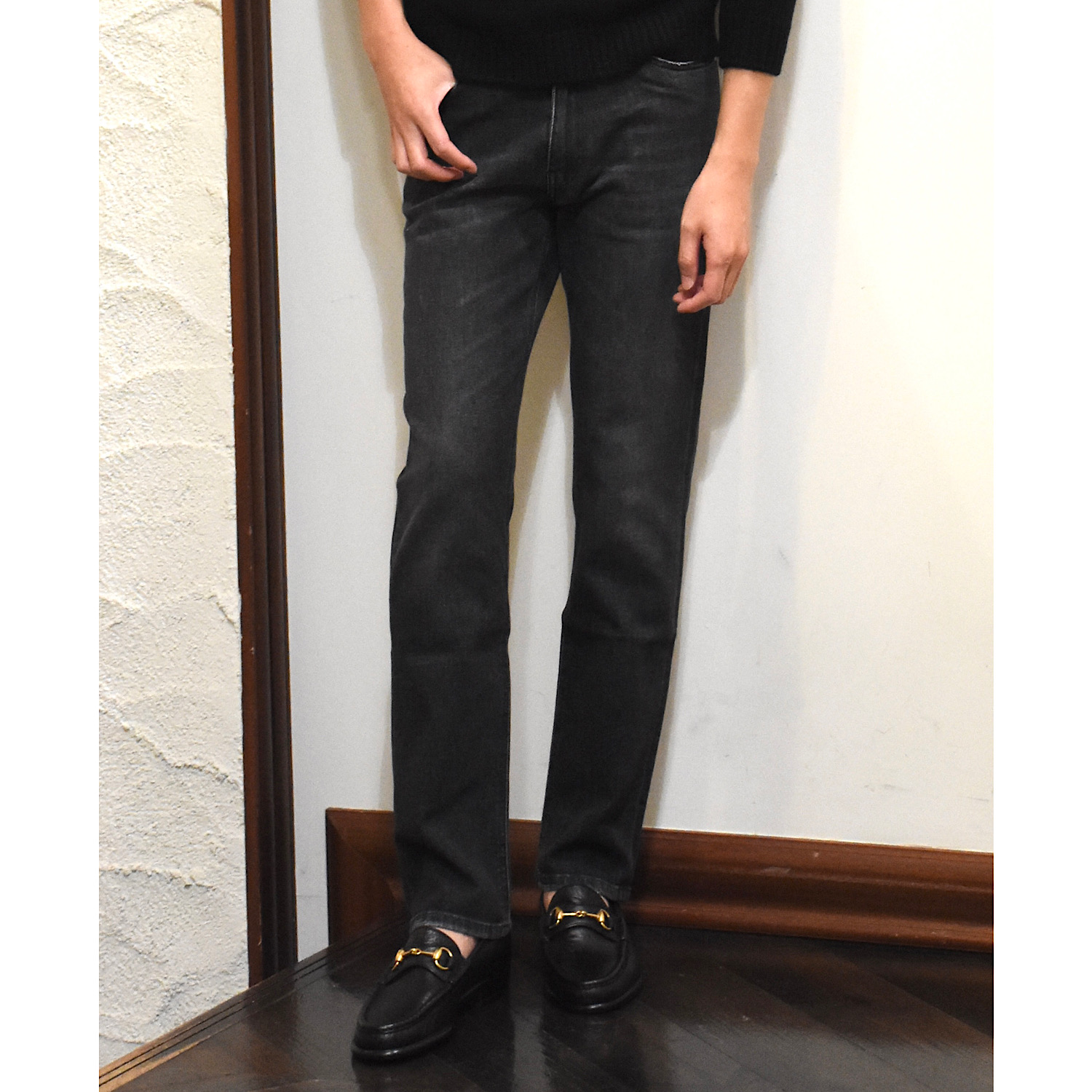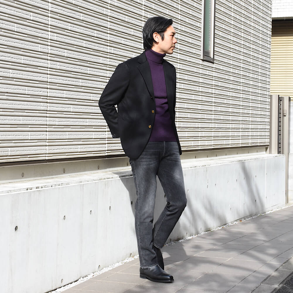 ・生地は12オンスのブラックデニムをミディアムウォッシュし、軽めの加工を入れることでこなれ感を加えたもの。色合いと加工具合にやり過ぎ感がなく、年齢問わず取り入れやすい仕上がりです。