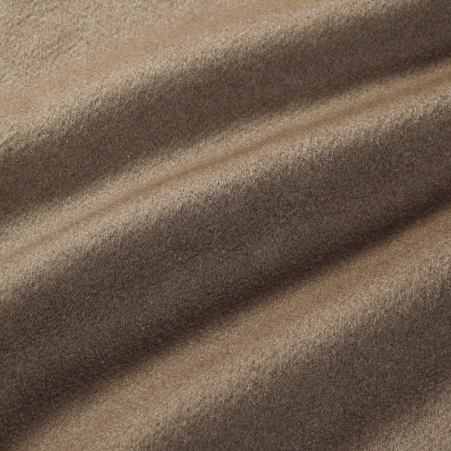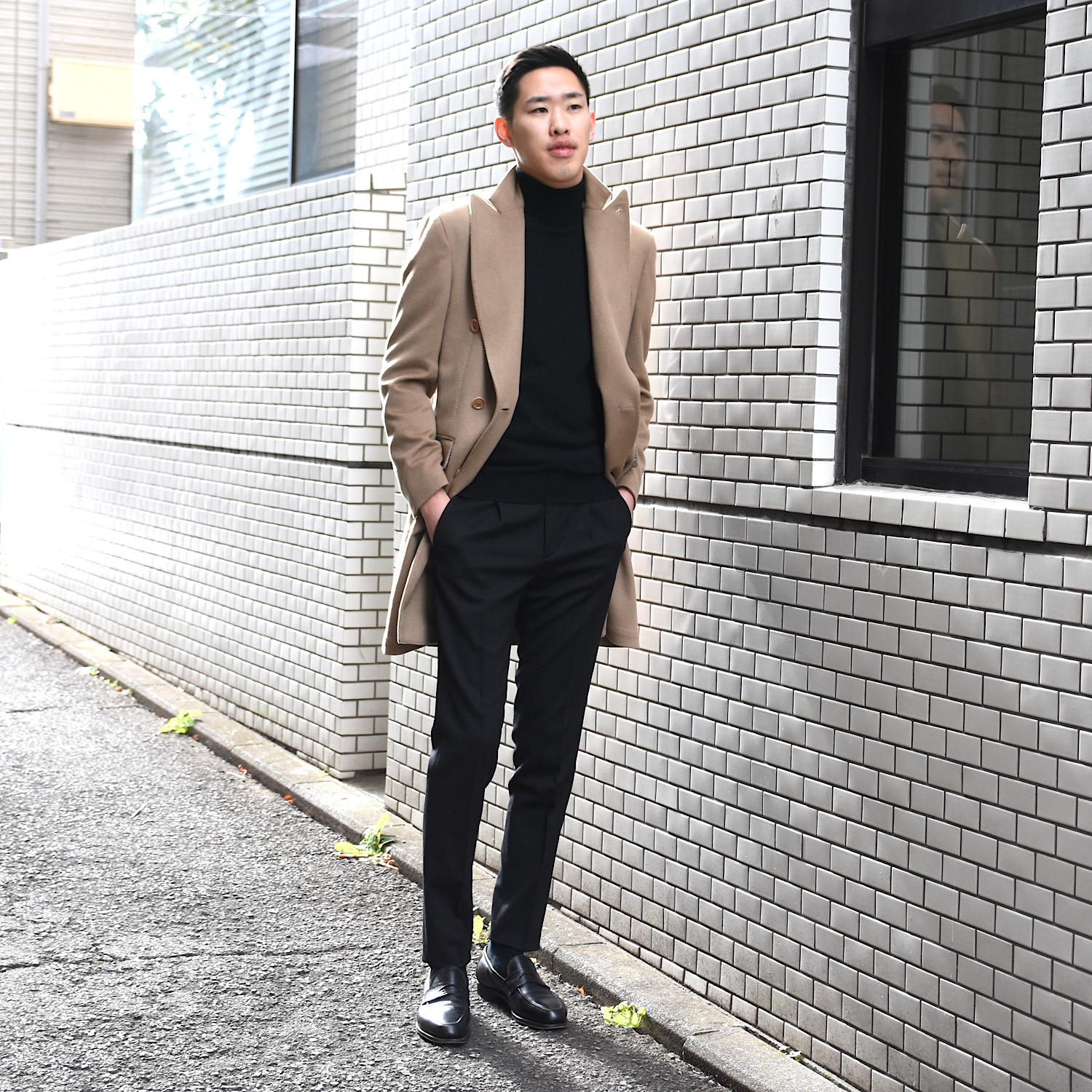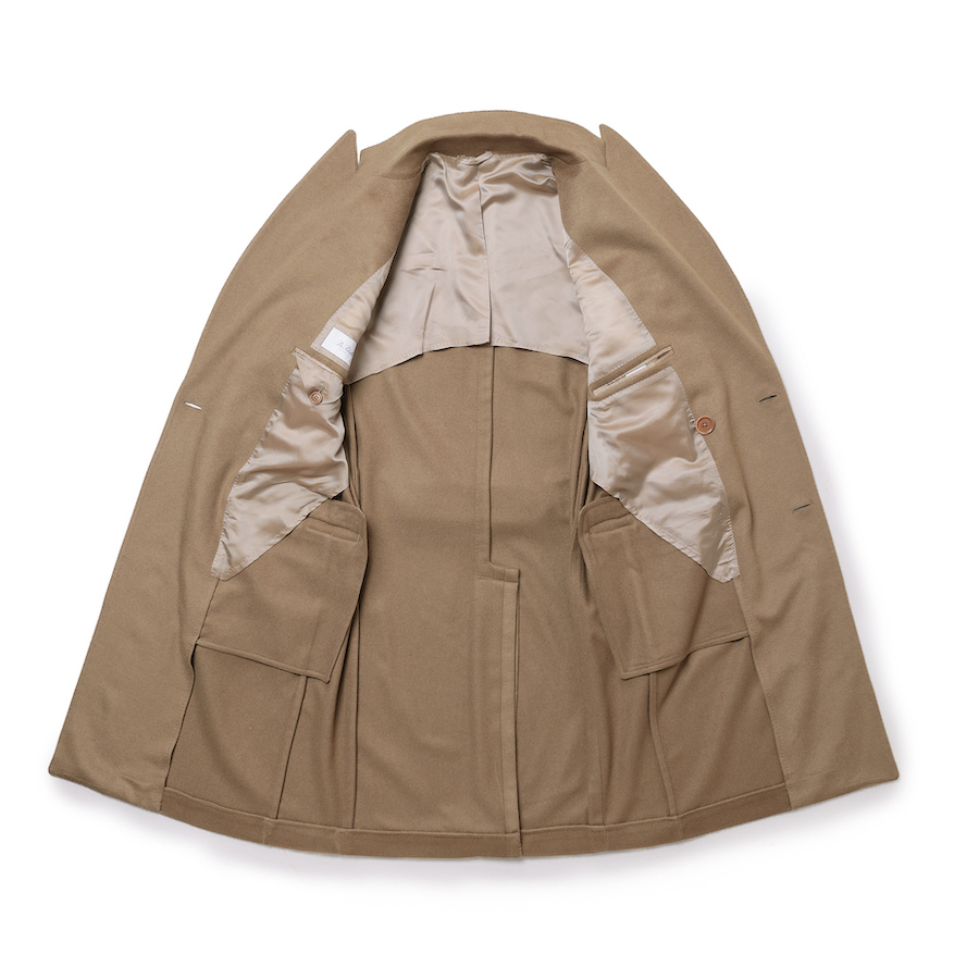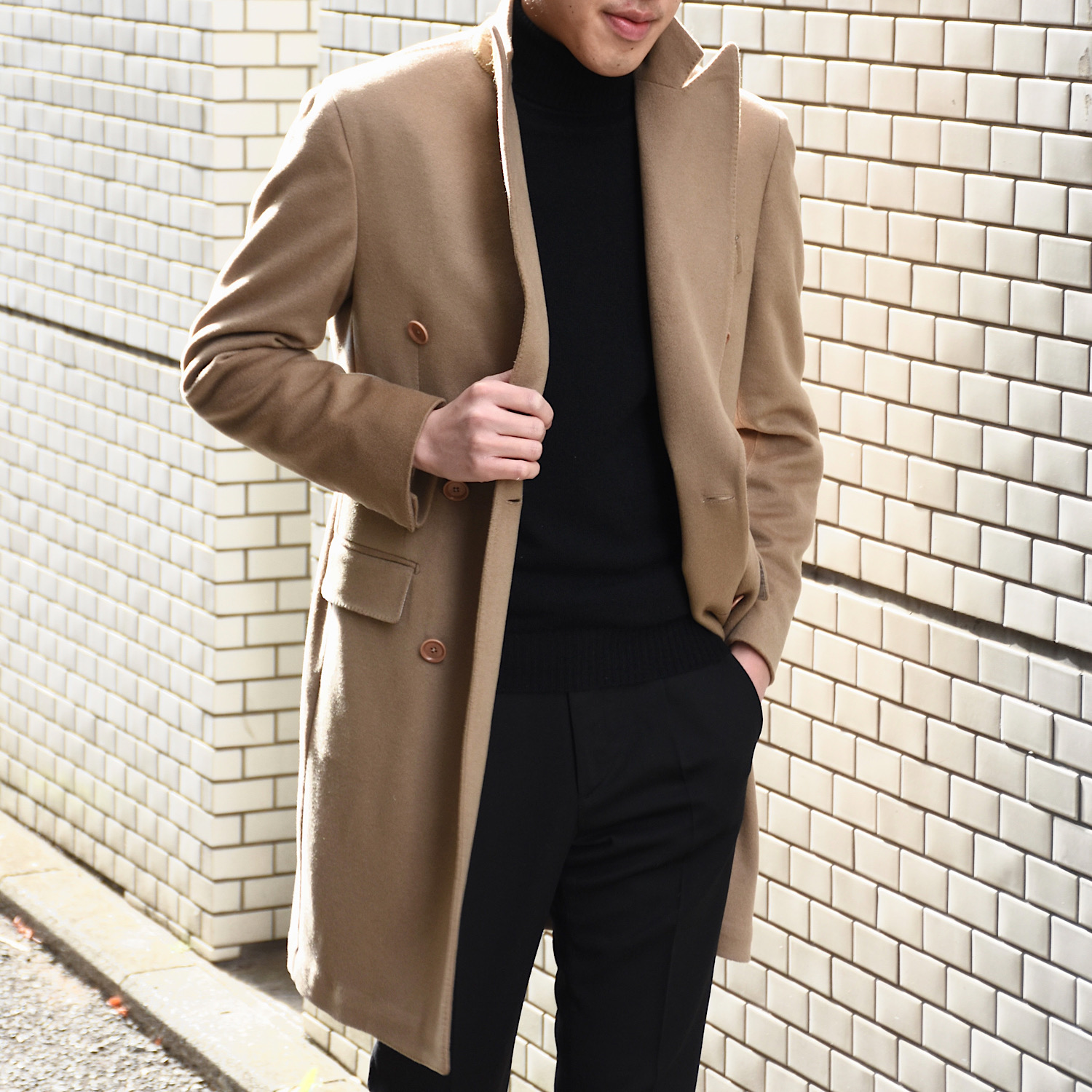 ・生地はカシミア100%。目付けが500グラムとしっかり感がありながら、カシミアならではの滑らかな手触りと微光沢感が実にラグジュアリー。世界中のどこに着て行っても通用するクオリティーです。