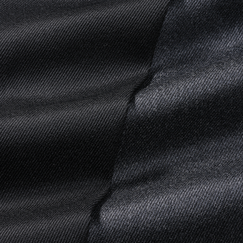・生地はウール100%のトリコチン素材。密に織り上げられた表情豊かな立体的な綾目が目を惹く生地です。適度な厚みでしなやか、ハリと弾力に富んだ風合いと美しいドレープ感、そして上品な微光沢感が特徴です。良い意味で季節感が薄いため、真夏以外の3シーズンで着用できます。