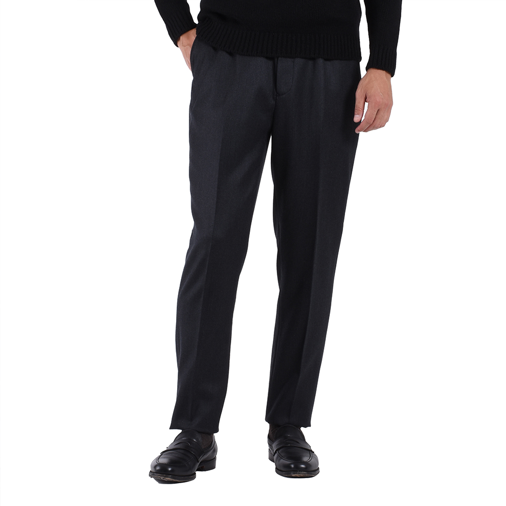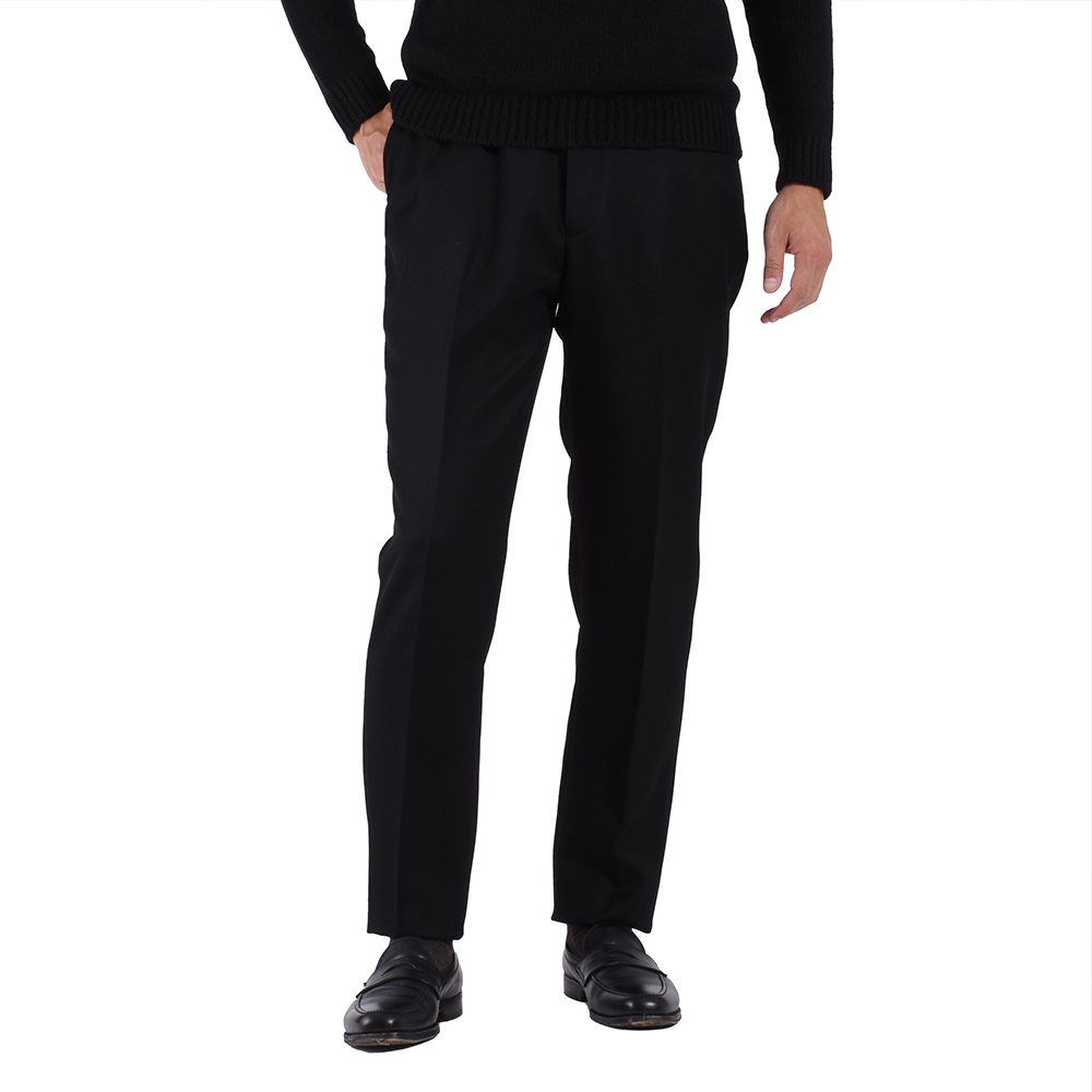 ・「EGRĒTIQUE(イグレティーク)」が手掛けるドローコードパンツは削ぎ落とされたデザインが特徴。内通しのドローコード、ベルトループは無し、腰にピッタリと沿う穿き心地にこだわりフロントジップは付いているものの前閉じ、といったストイックな仕様です。しかし、ドローコード自体の質感や紐先飾りは高級感があり、ヒップポケットのボタンはリアルホーンと妥協のない付属品が取り付けられています。立体的なパターンや膝裏地付きでスムーズな足通りが実現されていることからも、ドローコードパンツながら本格仕立てのトラウザーズと言えます。