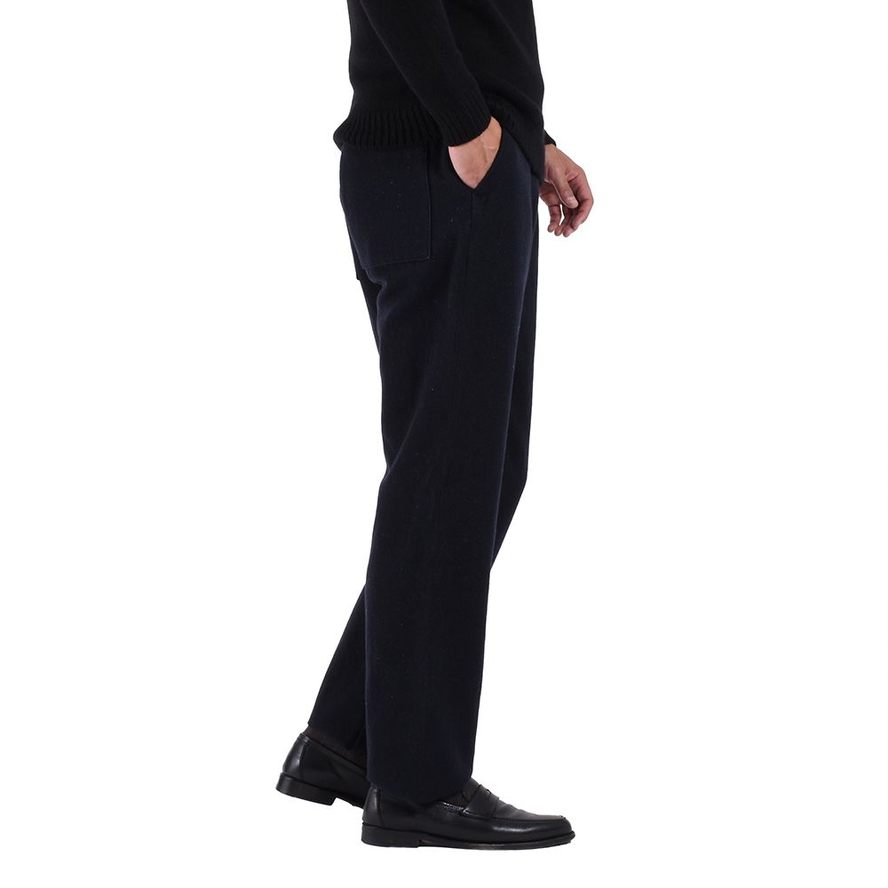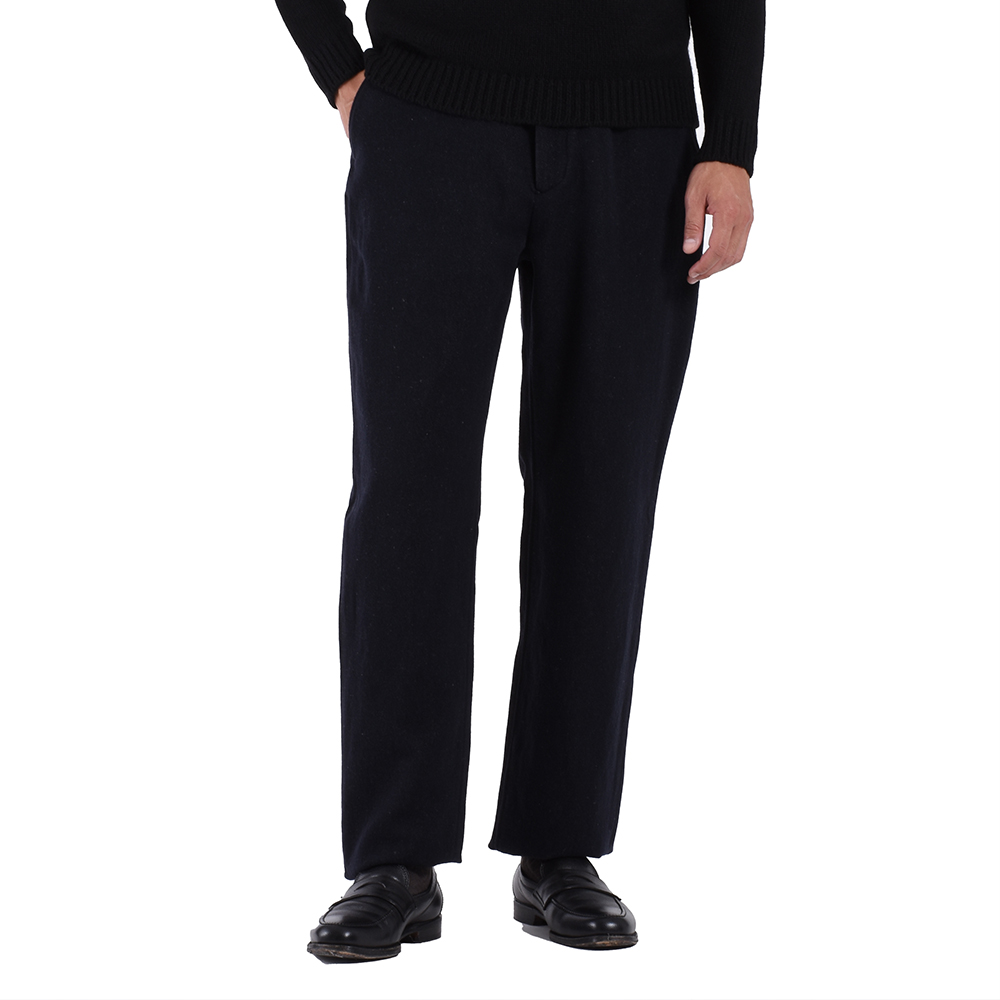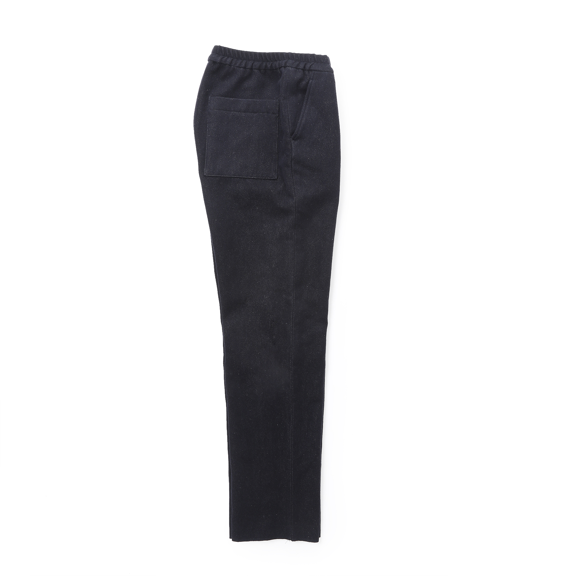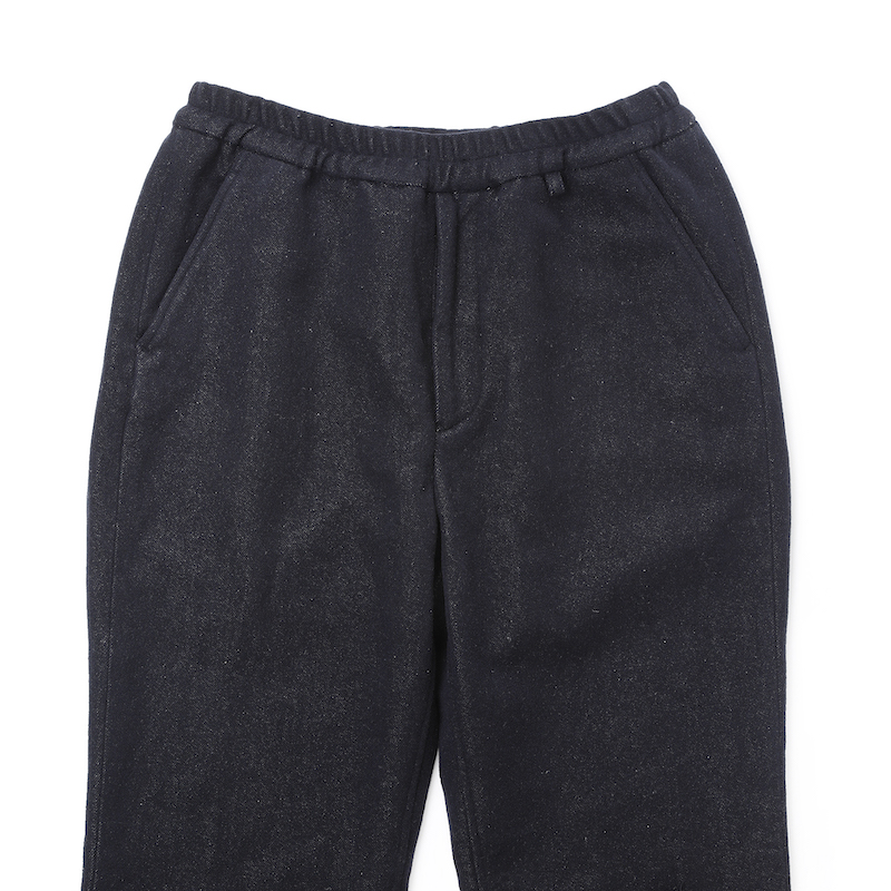 ・”casual”モデルは、適度に余裕を持たせた腰とヒップ周りからなだらかにテーパードするシルエット。センタークリースラインは入れられておらず、しっかり感のあるドローコードと後ろポケットがパッチになっており、その名の通りカジュアル感があります。しかしながら、立体的なパターンや膝裏地付きでスムーズな足通りが実現されていることで、ドローコードパンツながら本格仕立てのトラウザーズといった表情を持ち合わせます。1色のラインナップ。