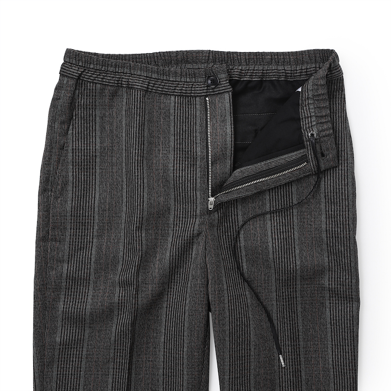 ・「EGRĒTIQUE(イグレティーク)」が手掛けるドローコードパンツは、ベルトループは付いておらず、内通しのドローコード仕様といった削ぎ落とされたデザインが特徴。しかし、ドローコード自体の質感や紐先飾りには高級感があり、ヒップポケットのボタンはリアルホーンと妥協のない付属品が取り付けられています。立体的なパターンや膝裏地付きでスムーズな足通りが実現されていることからも、ドローコードパンツながら本格仕立てのトラウザーズと言えます。