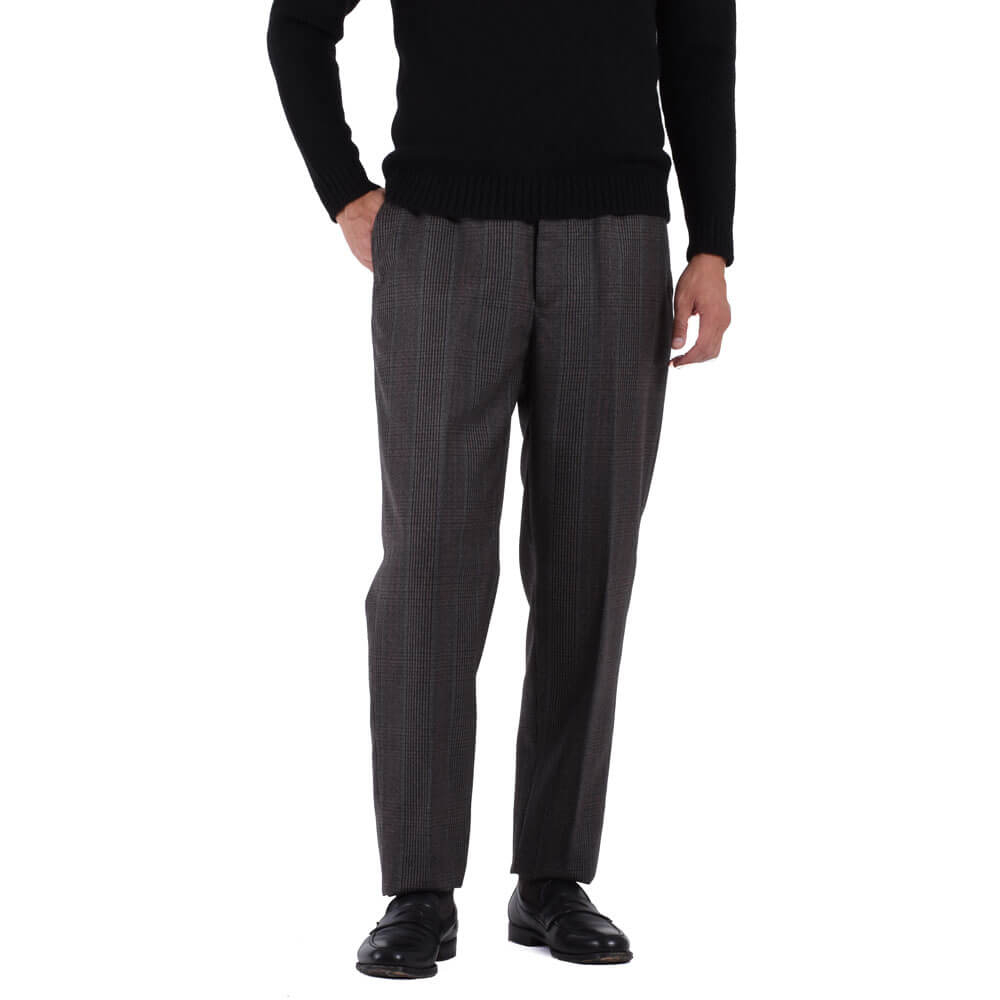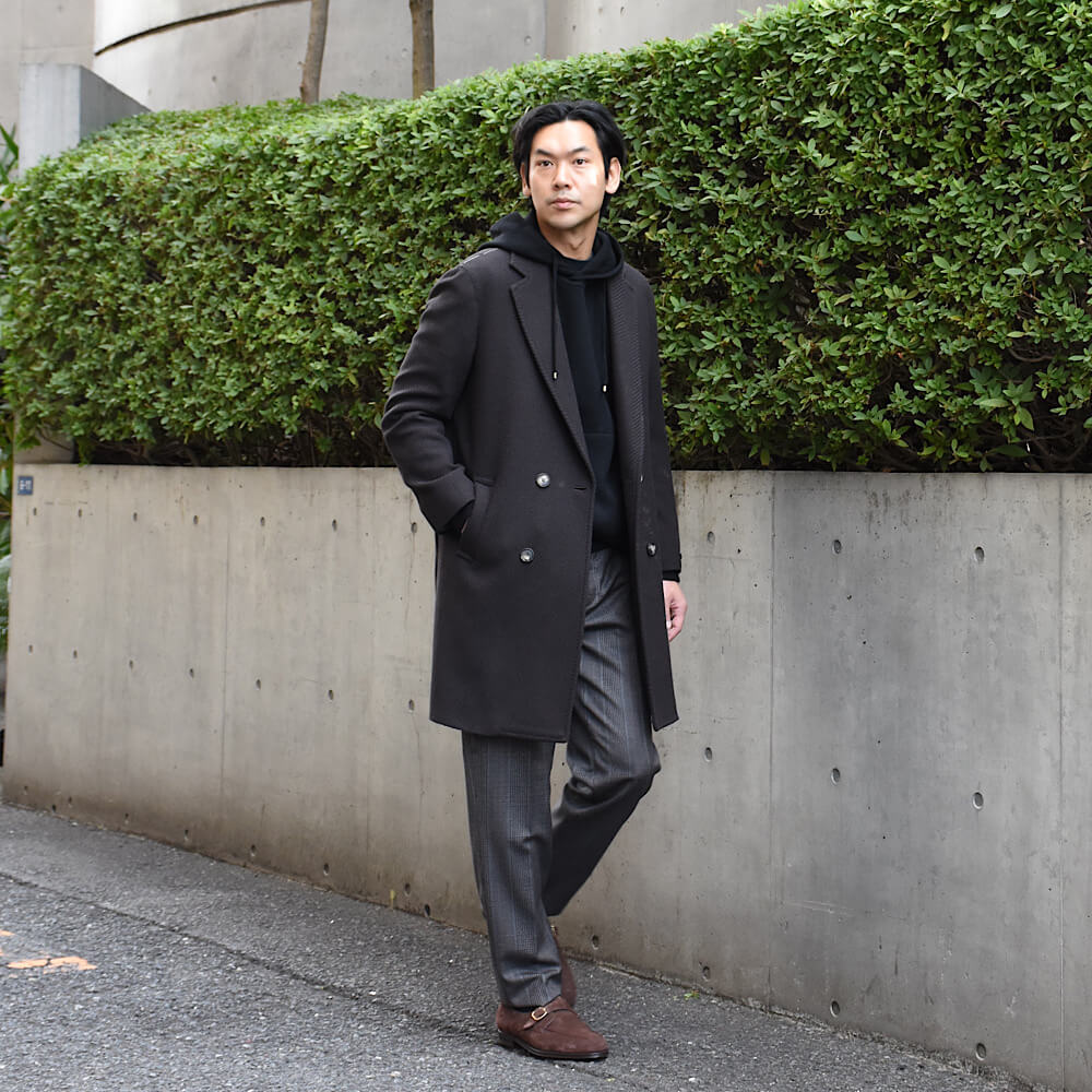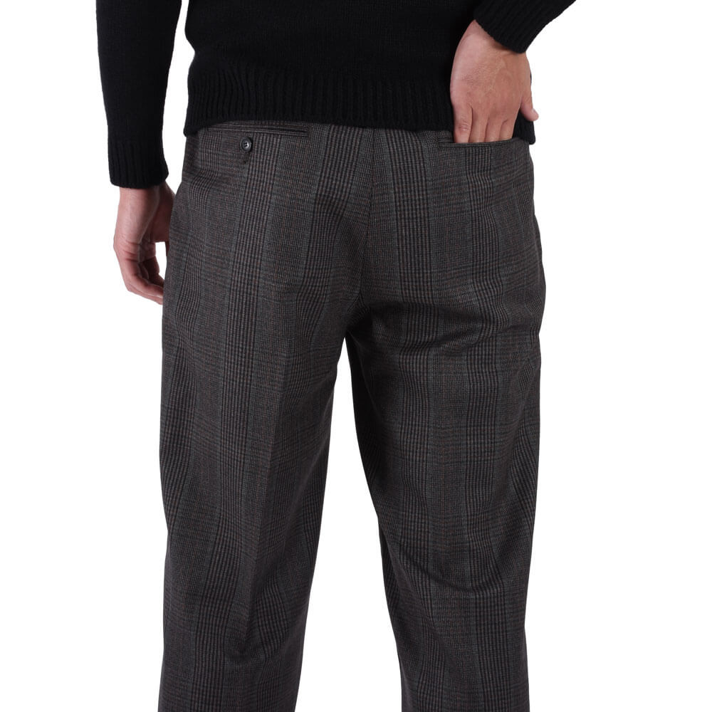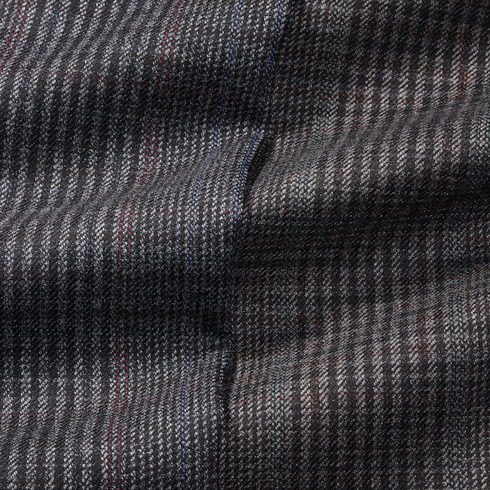・生地はウール100%。配色の妙が冴えるチェック柄は、厳選された色の組み合わせで柄を構成した多彩な見え方で実にモダン。密でありながらもハリと弾力の富んだ風合いとドレープ感が相まり、上質さを醸す生地感が特徴的です。