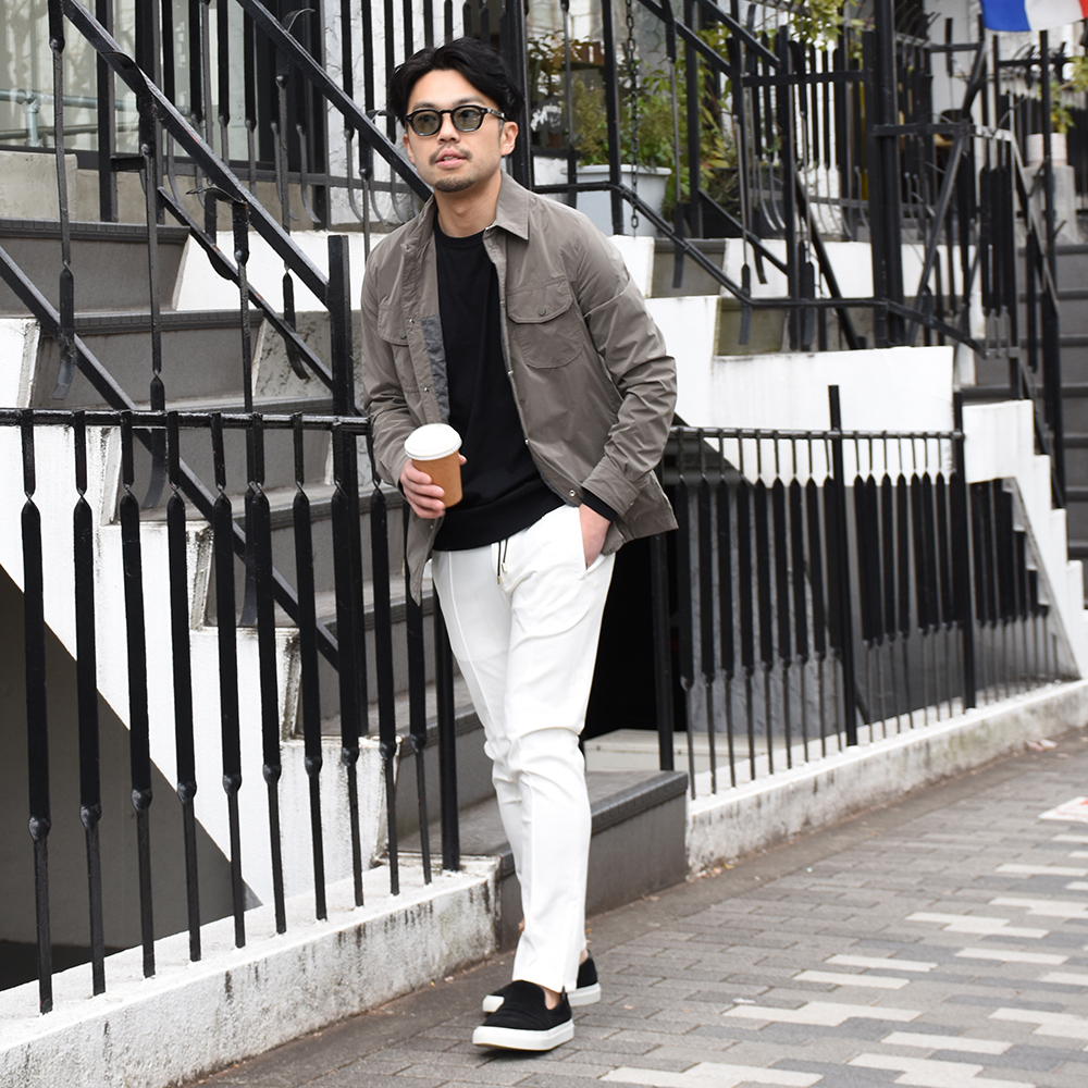 ・合わせるパンツはデニムなどのコットン素材、ナイロン系、ウールスラックスで綺麗めに合わせてもOKです