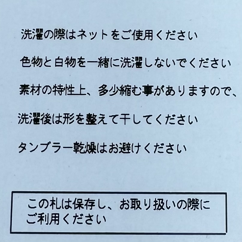 ※ご自宅で洗濯(ドライ/手洗いコース)された場合に縦方向/横方向ともに若干の縮みがでます