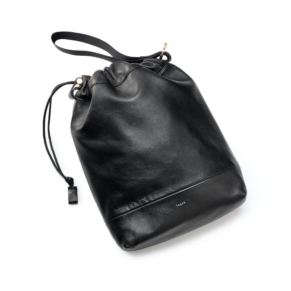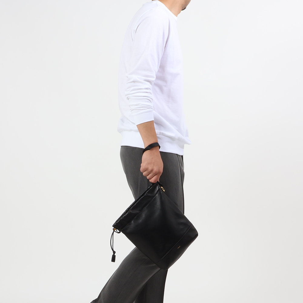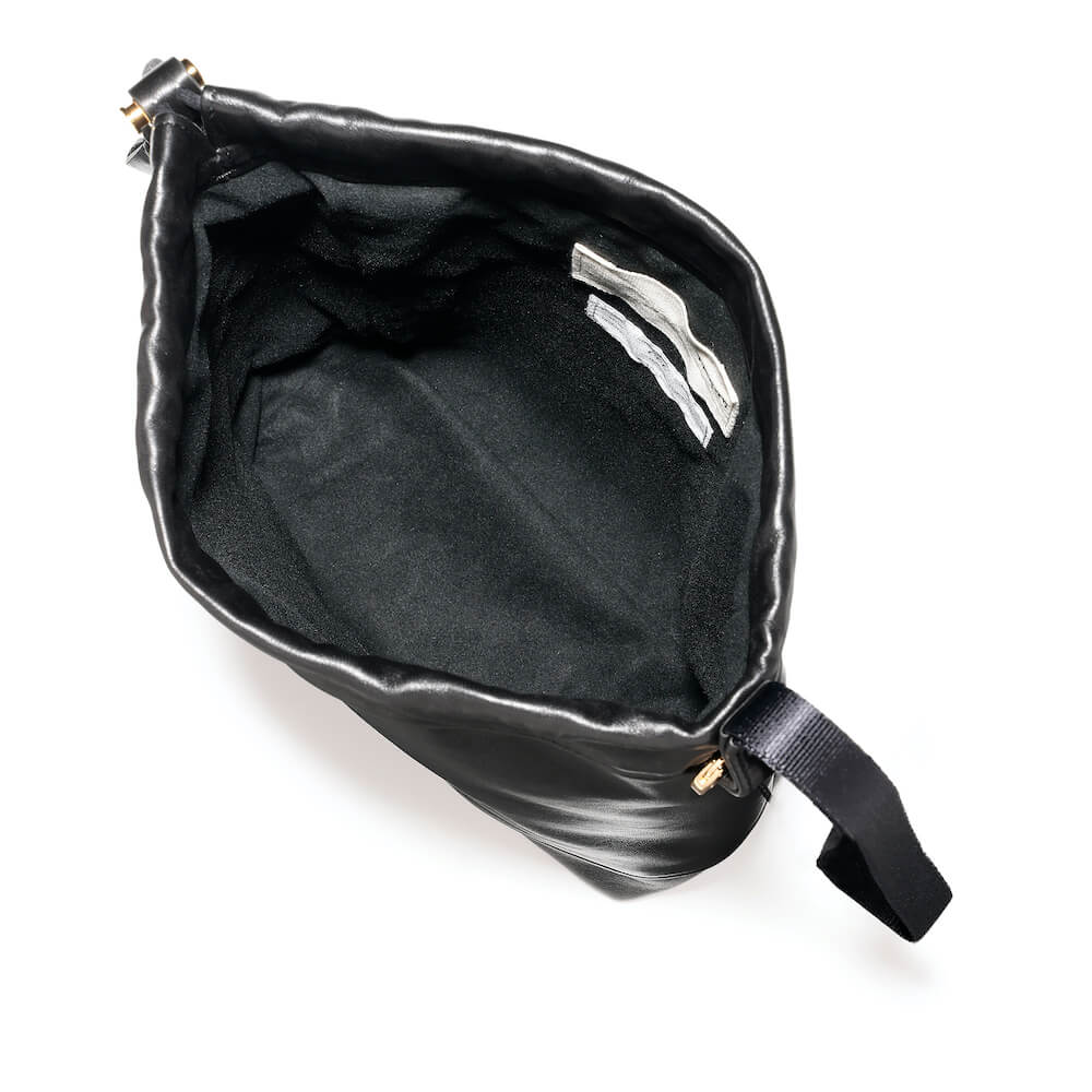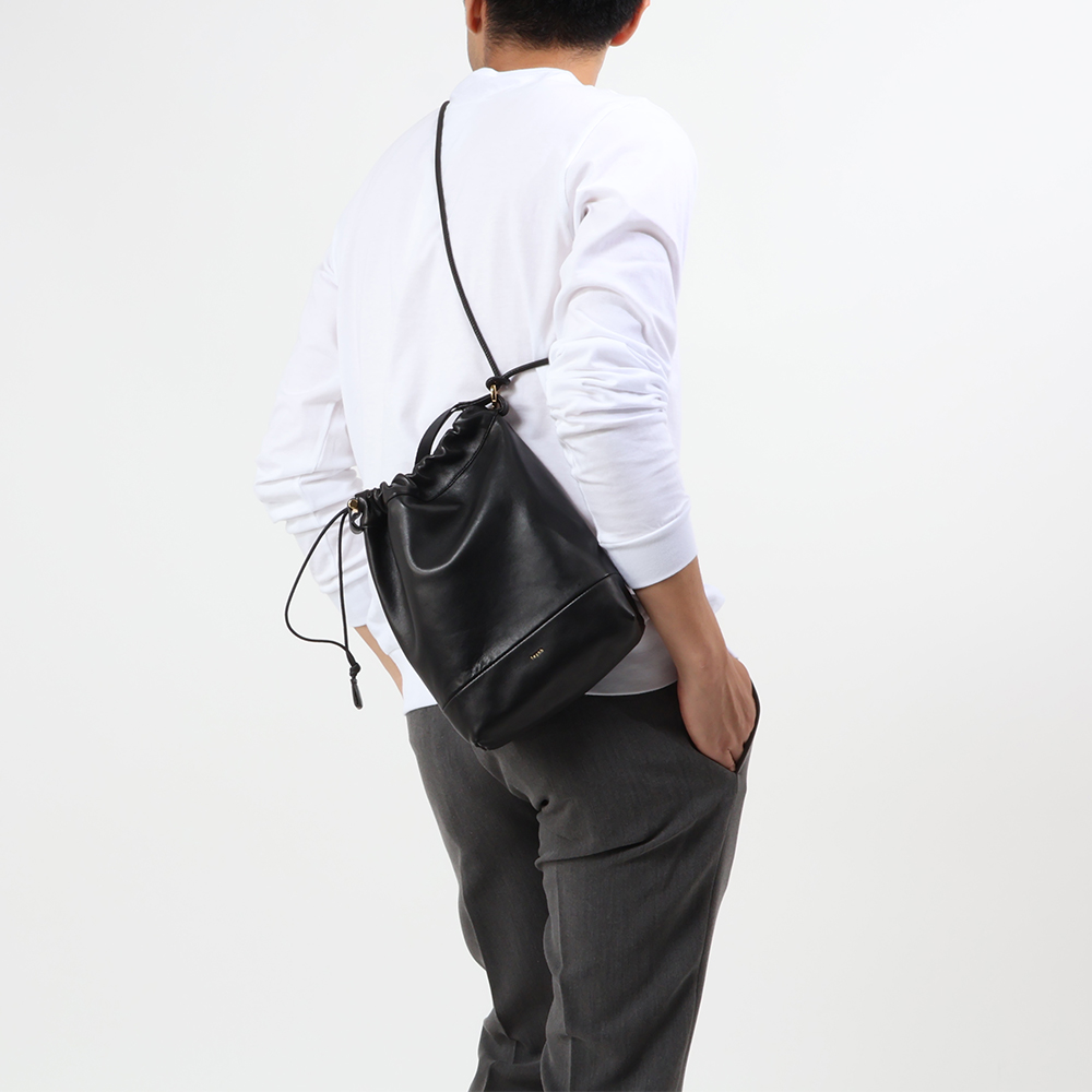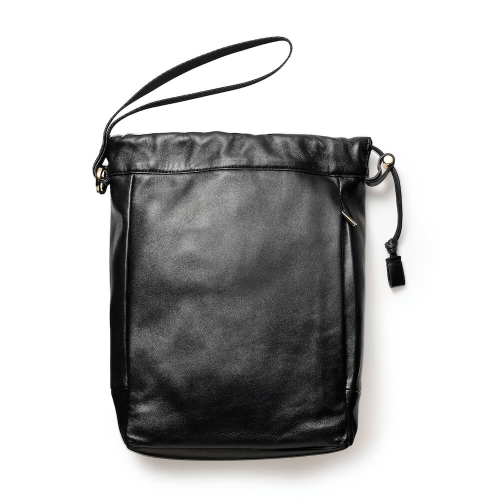 ・本体にはフレンチラムレザーを使用。きめ細やかでしっとりとした手触りが実に心地良いです。また、本体と同じラムレザーを細く繊細に縫製して作り上げた上部入口を絞るためのレザーコードがプロダクトの上質さを際立たせます。さらに、ドローコードパーツ、リングフック、ブラススタッズ、ジップ、そしてさりげなく入れられたロゴがゴールドでまとめられている点がラグジュアリー。