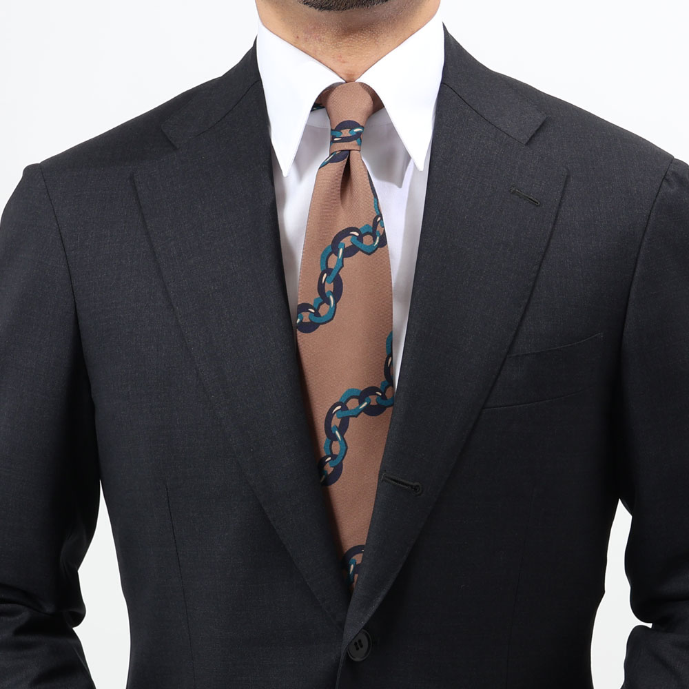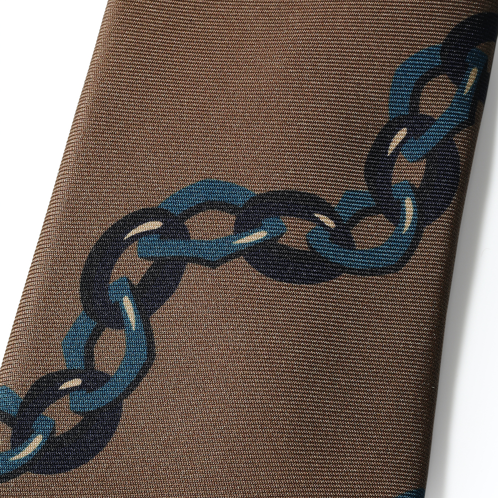 ・ロンドンが出自のネクタイブランド「Holiday & Brown(ホリデーアンドブラウン)」は、色使いや柄にさりげなくブリティッシュフレイバーを感じさせつつも、ヴィンテージ感ある柄や色使いを現代的にアップデートさせているのが持ち味です。こちらはチェーンモチーフのプリントタイ。