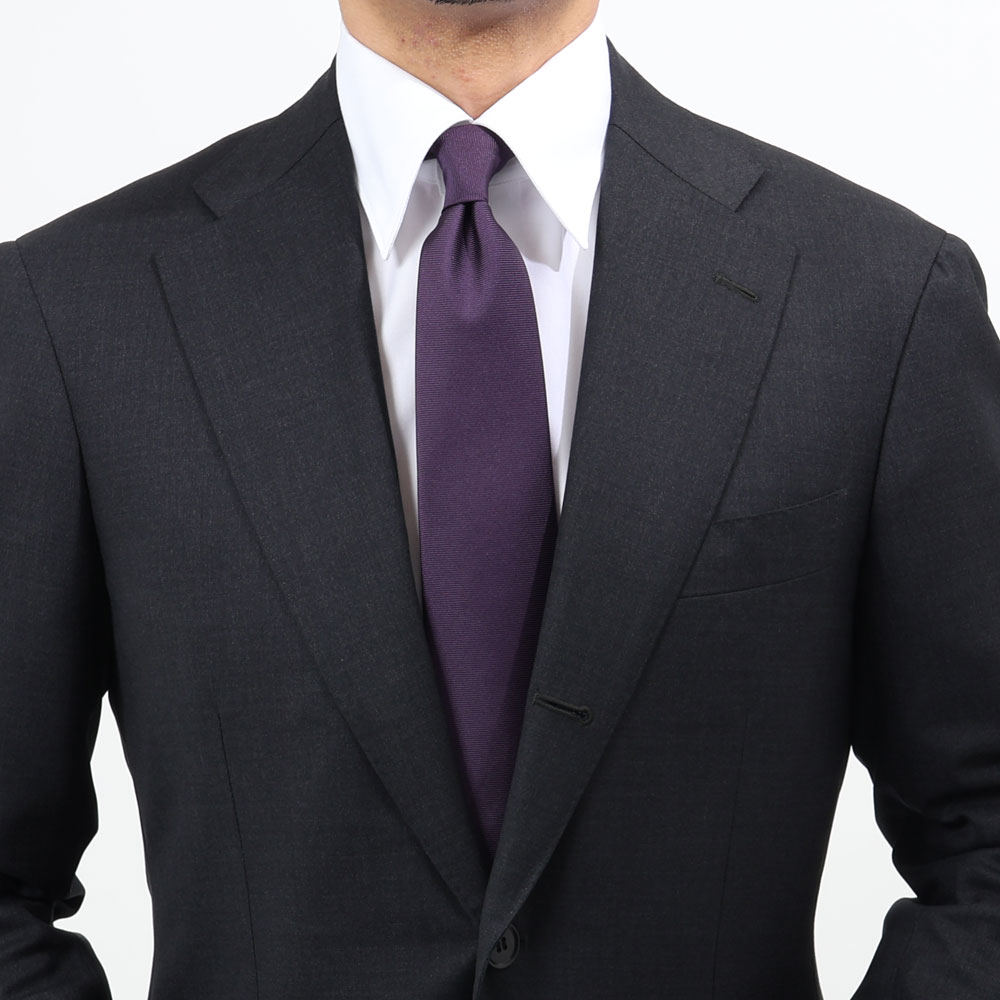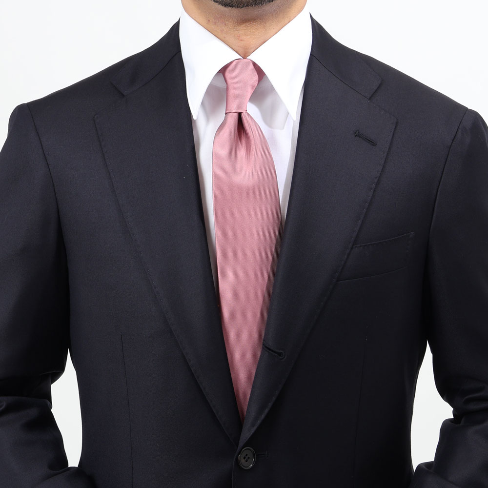 ・こちらはシルク100%のツイル生地を横使いすることで、ちょっと変化を持たせたソリッドタイ。白シャツにはもちろんですが、薄いベージュやグレーといった色合いのカラーシャツの合わせると実に洒落た雰囲気に。