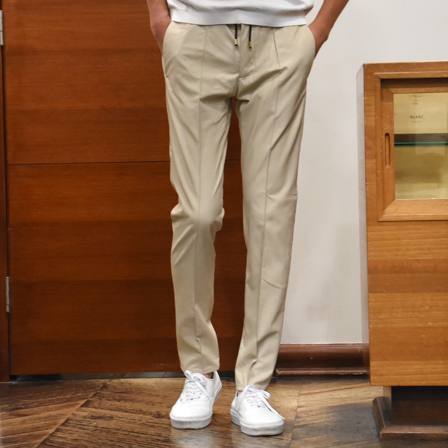 ・モデルは「giabsarchivio(ジャブスアルキヴィオ)」ならではの工夫が施されたリラックスパンツの"MASACCIO(マサッチョ)"。シャープで美しいシルエットを実現している理由はフロントにクリースをおさえるステッチが入っているから。縦のラインが強調され、視覚的な脚長効果は抜群です。