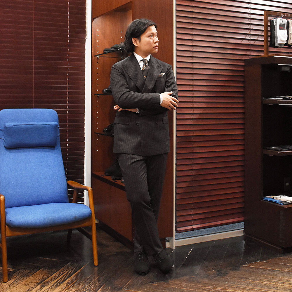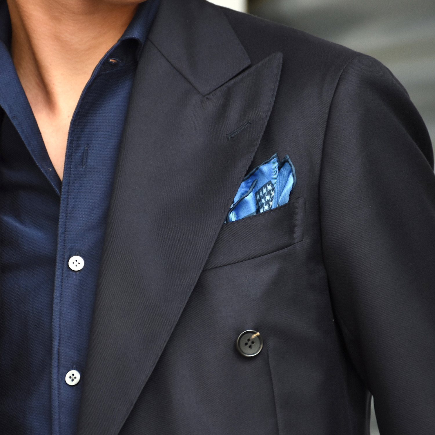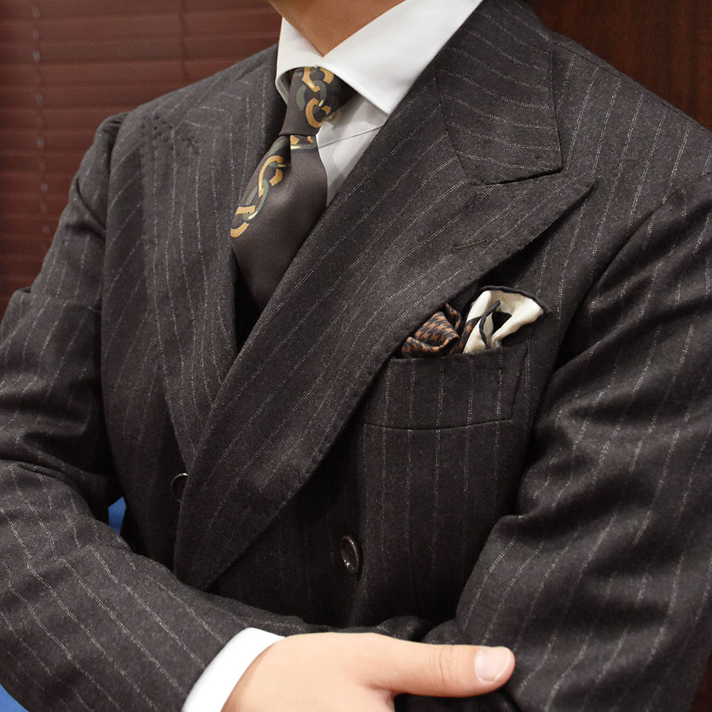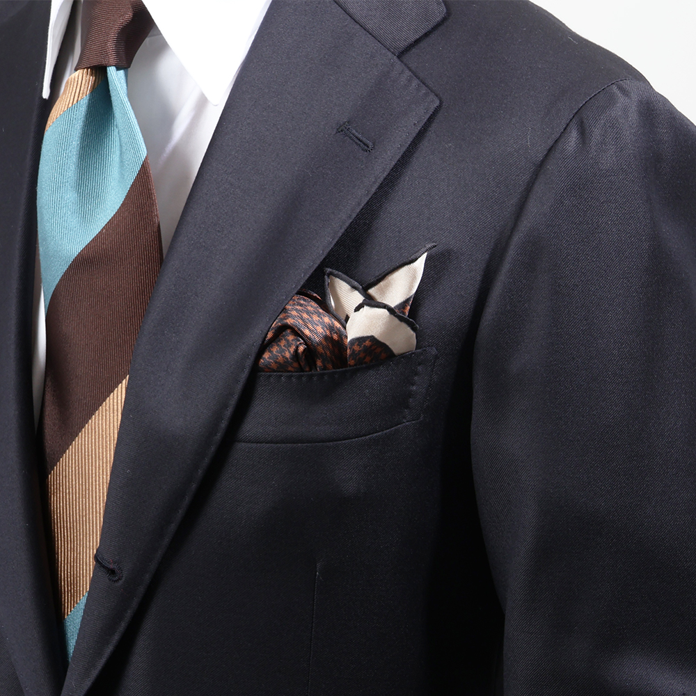 ・タイドアップの際はもちろんのこと、インナーをタートルニットで外した際やノーネクタイの際に華やかなシルクチーフでバランスを取り、寂しく見えないようにするのもテクニック。ぜひお試しください。