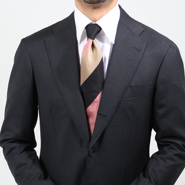 ・”段落ち“と呼ばれる幅広のストライプは、キリッとした印象のVゾーンに。
