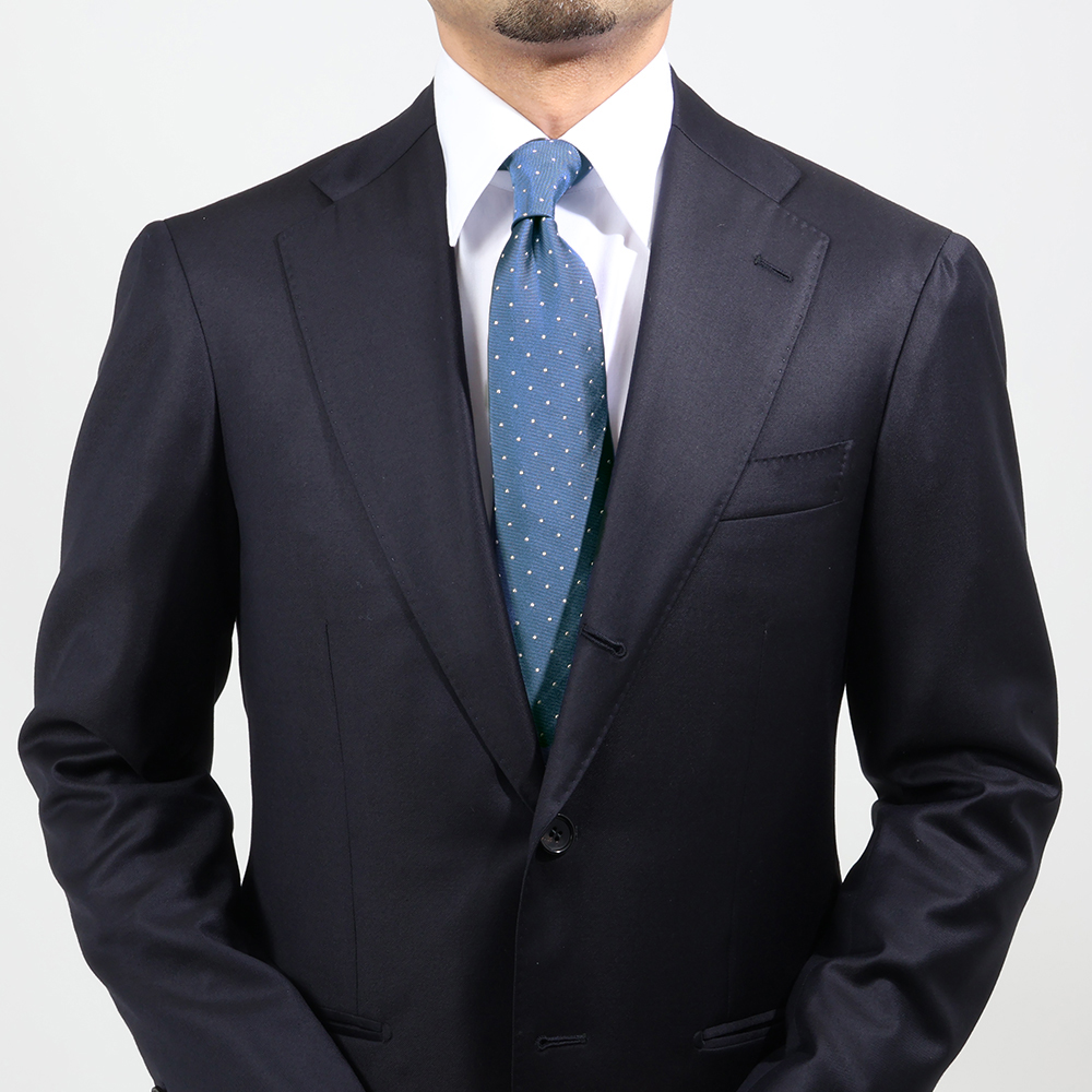 ・年齢問わず清潔感を演出できるドット柄はワードローブにあると力強い味方になります。ビジネスシーンはもちろんのこと、白リネンチーフを合わせて華やかな席でもどうぞ。
