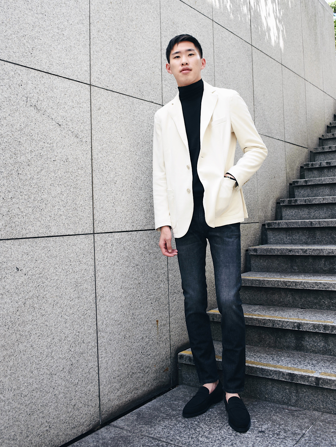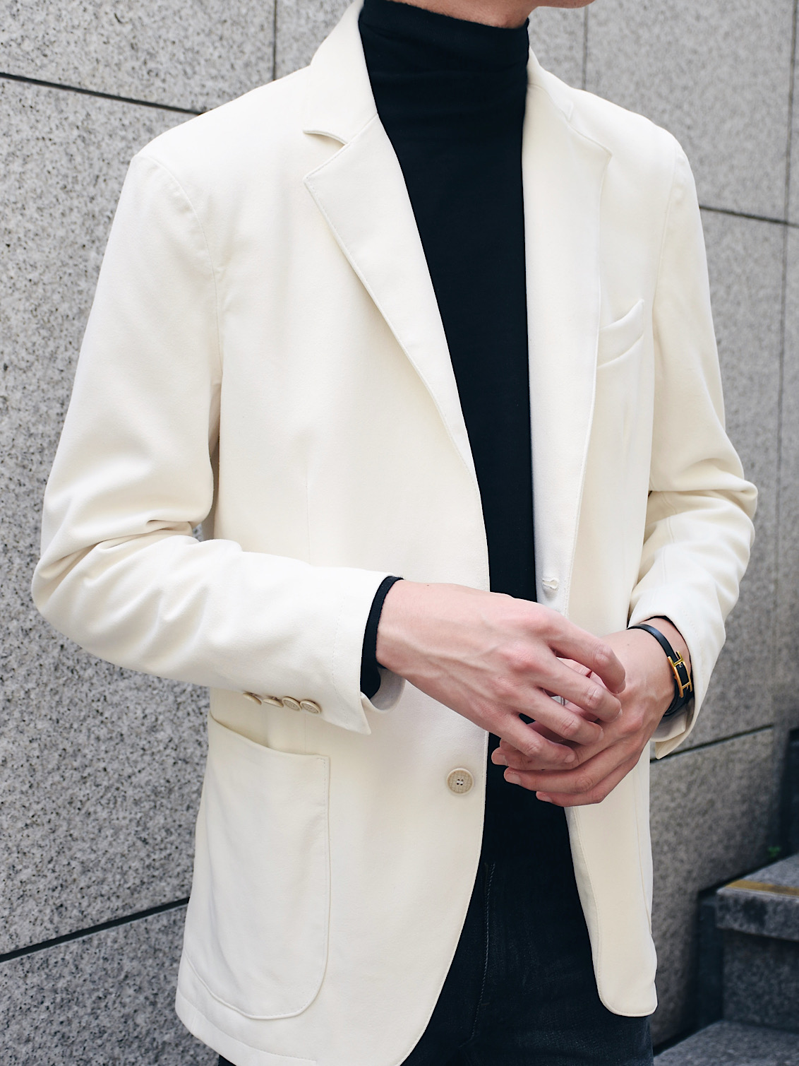 細身体型でサイズ46を着用。