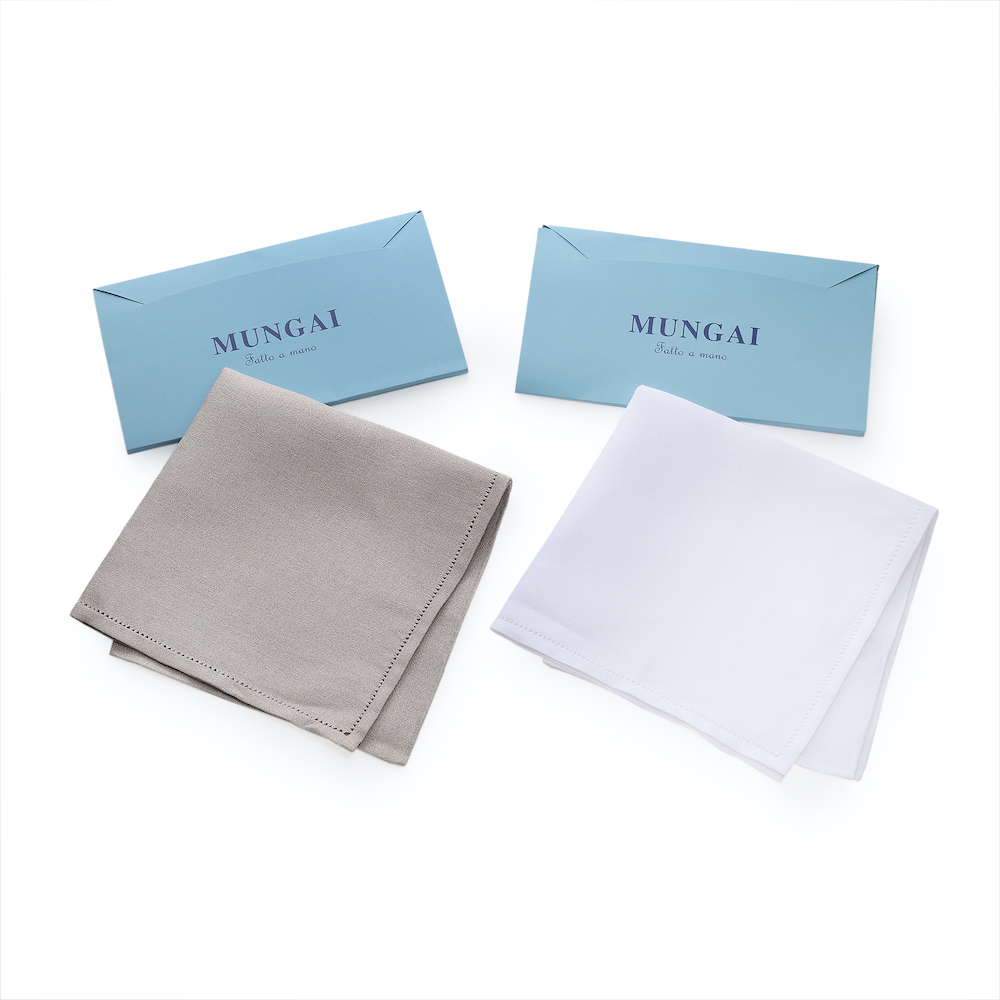 ・こちらのハンカチは、その「MUNGAI(ムンガイ)」の卓越した職人の技術により全てをハンドメイドで仕上げたMade in Italyを体現する至高の逸品。2面をイタリア語で「Orlo a giorno-オルロアジョルノ」と呼ばれる美しい三つ折りのヘムステッチに仕上げ、もう2面をハンドロール仕上げにしています。