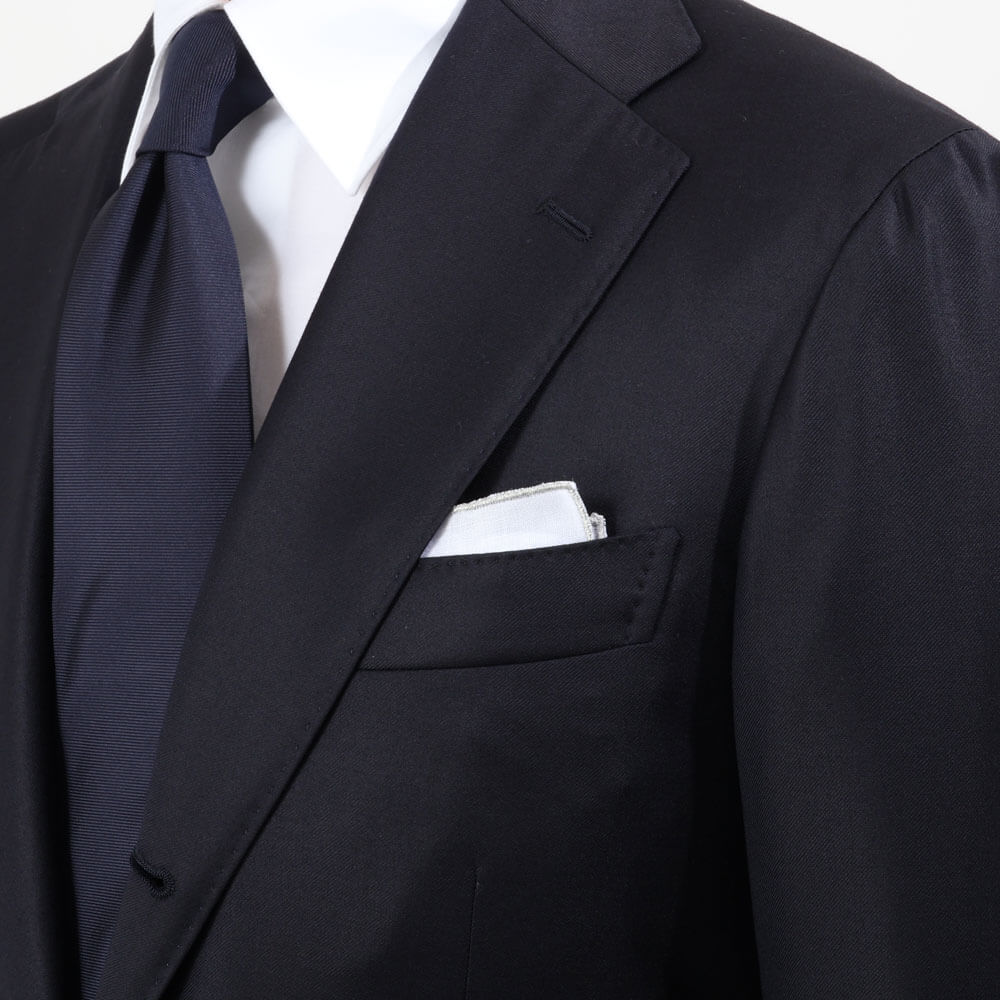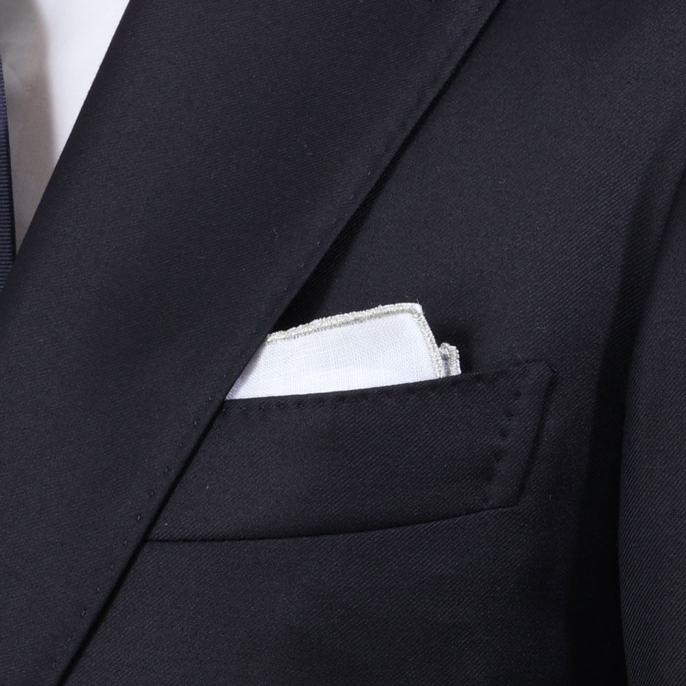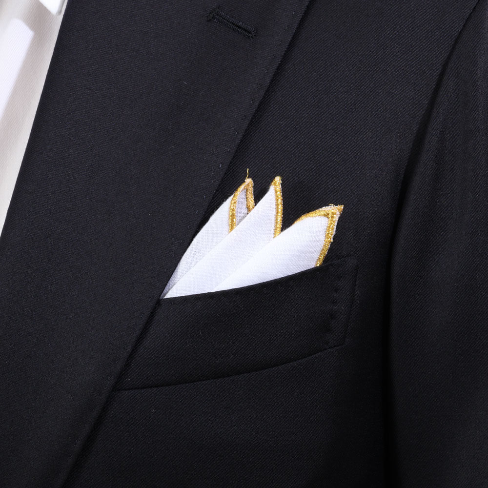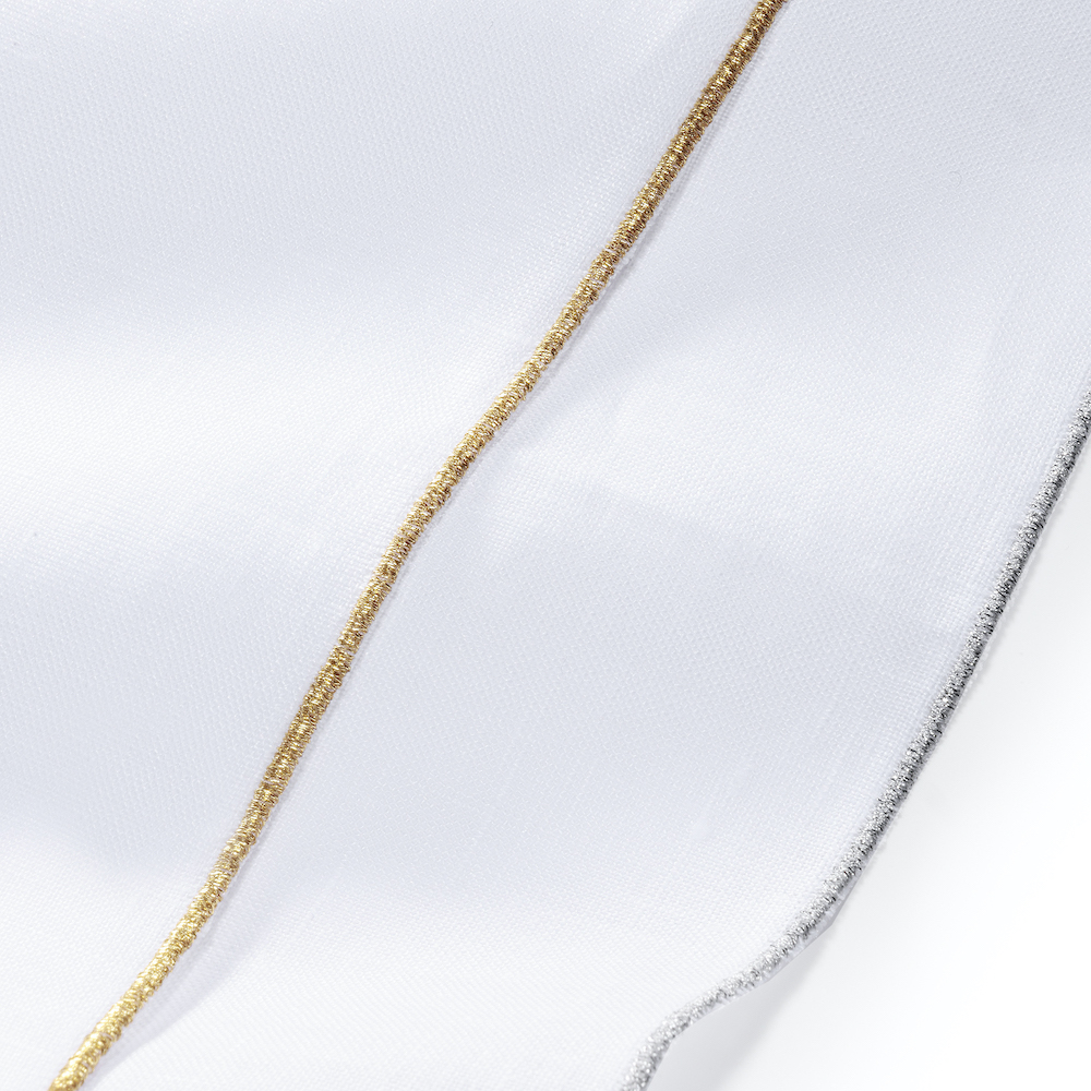 ・最上級リネンを使用したチーフの縁(ヘム)にシルバーとゴールドのラメ糸で華やかな装飾を施した一枚。