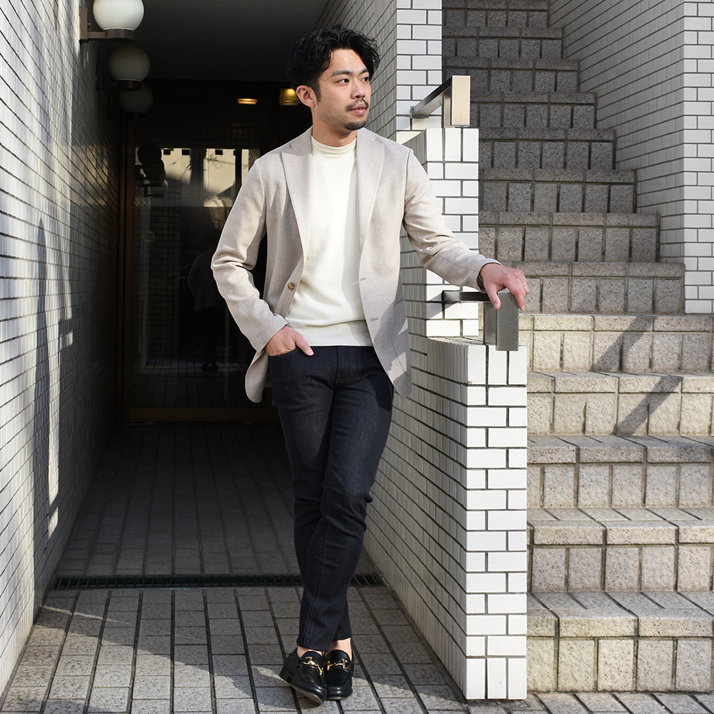 ・ハイゲージながら身体のラインを拾わず、クセのないスタンダードなシルエット。ゆえに着こなしの幅がとても広い一着です。