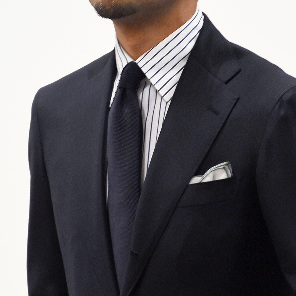 ・最大の特徴は長さを2サイズ(146センチと150センチ)でご用意した点(ダークネイビーのみ)。日本で流通しているネクタイは146センチ前後がスタンダードになりますが、首や体格がしっかりされている方だと小剣が結構短くなってしまい、スーツスタイルの身嗜みとして合格とは言えません。また、スマートな体型の方でもハズしで大剣よりも小剣を長く見せる、といった着こなしにも対応できるように仕上げました。
