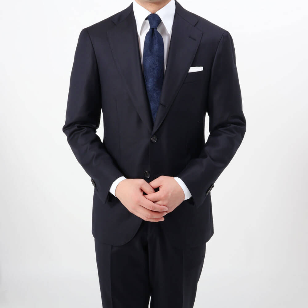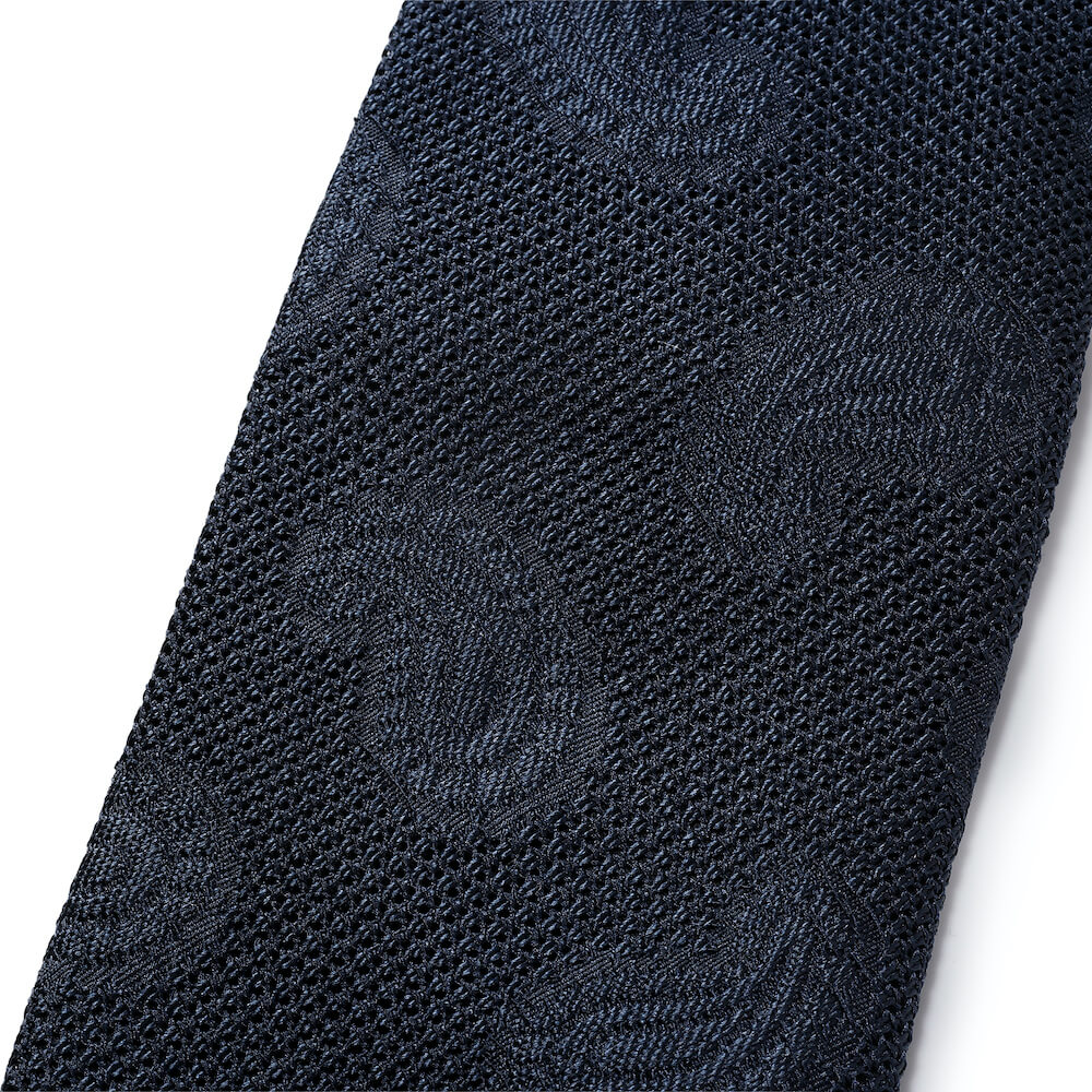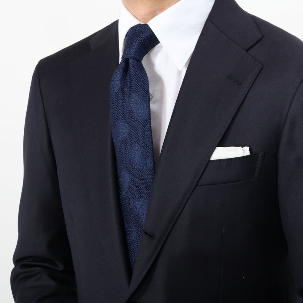 ・同色ネイビーでフレスコ織りにペイズリー柄をあしらった一本は、Vゾーンがグッと締まりつつ、フレスコ織りならではの清涼感や軽快さももたらします。