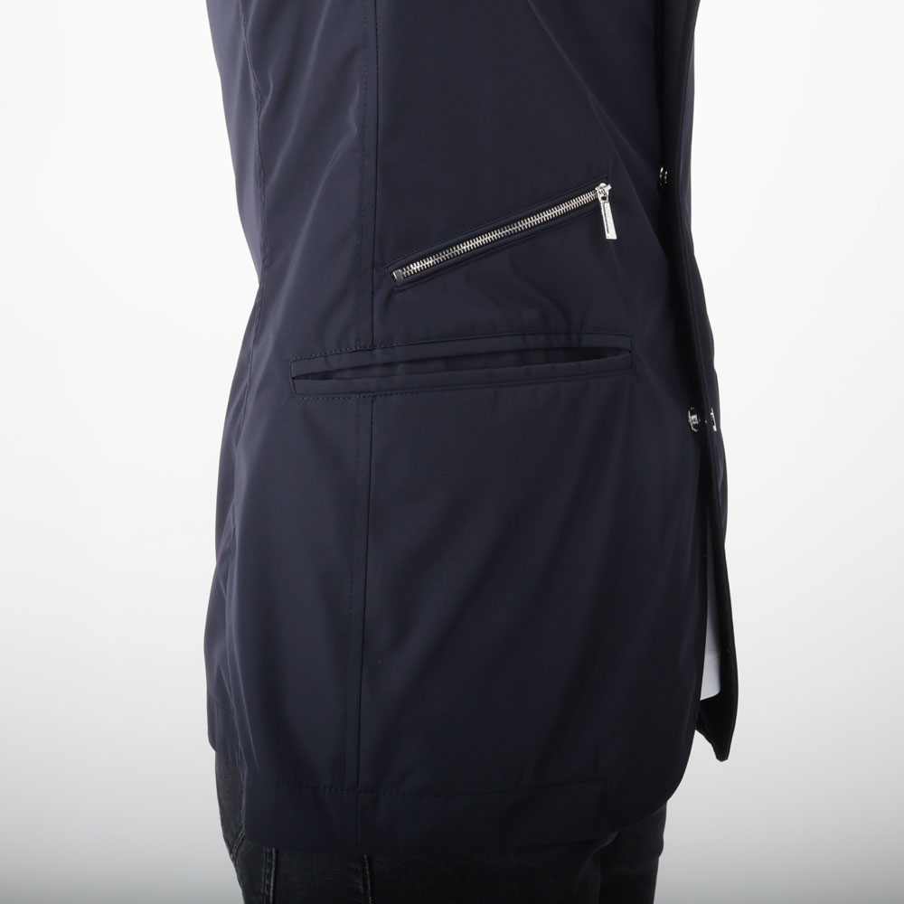 ・袖はカフス仕様でスナップボタンで開閉。ジップ付きチェンジポケットとフラップ付き腰ポケット(フラップは仕舞えます)が前身頃に取り付けられ、前裾がラウンドカットになっていることで、スポーティ過ぎないルックスに仕上げられています。
