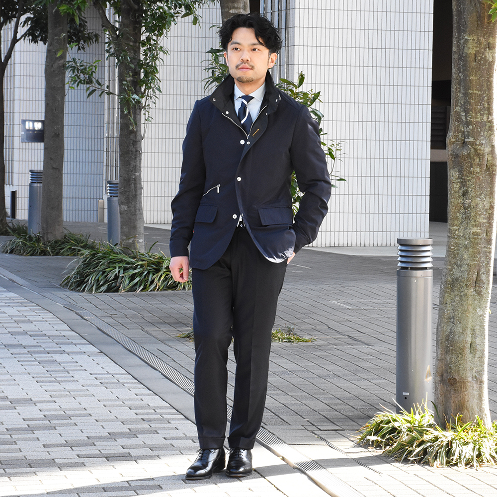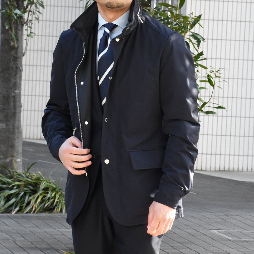 ・綾織りポリエステルのシェルは、適度なハリとコシを備え、上品な微光沢感により、高級感たっぷり。適度なフィット感が得られるシルエットが大人のために作られたアウターということを物語ります。