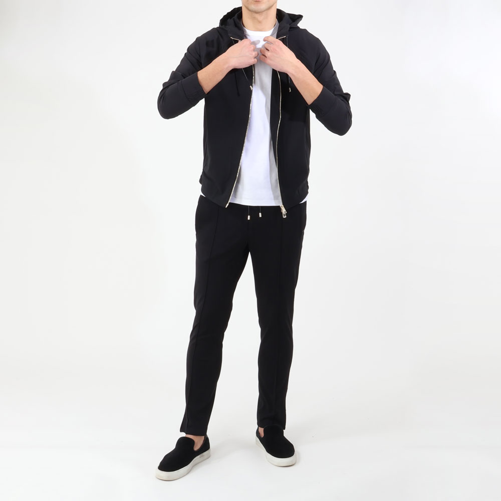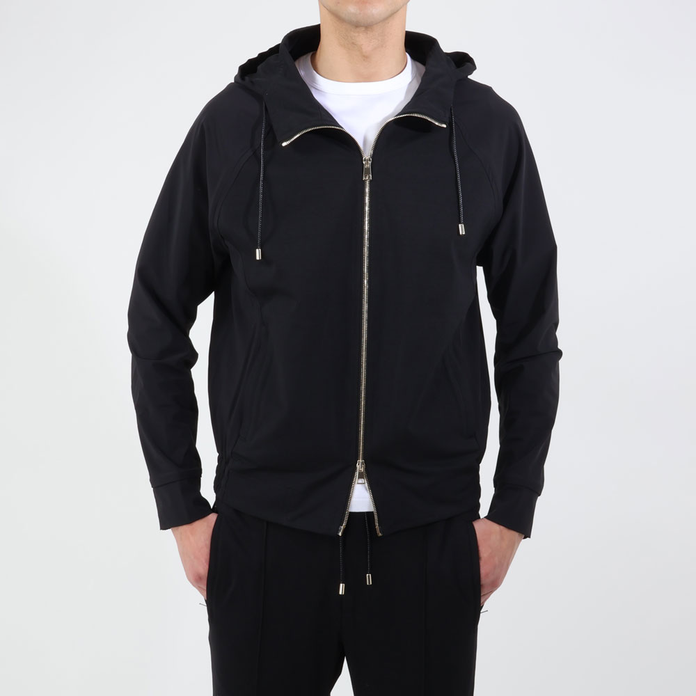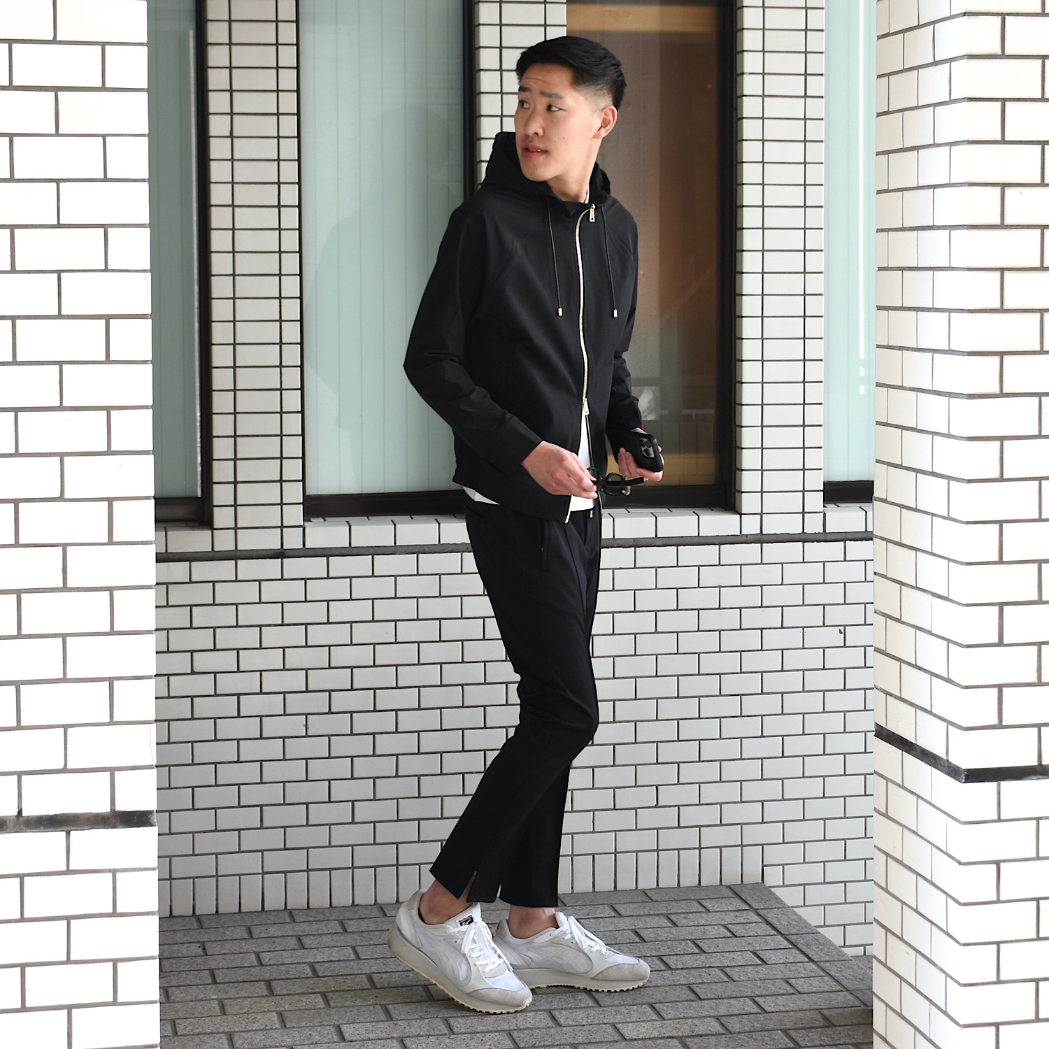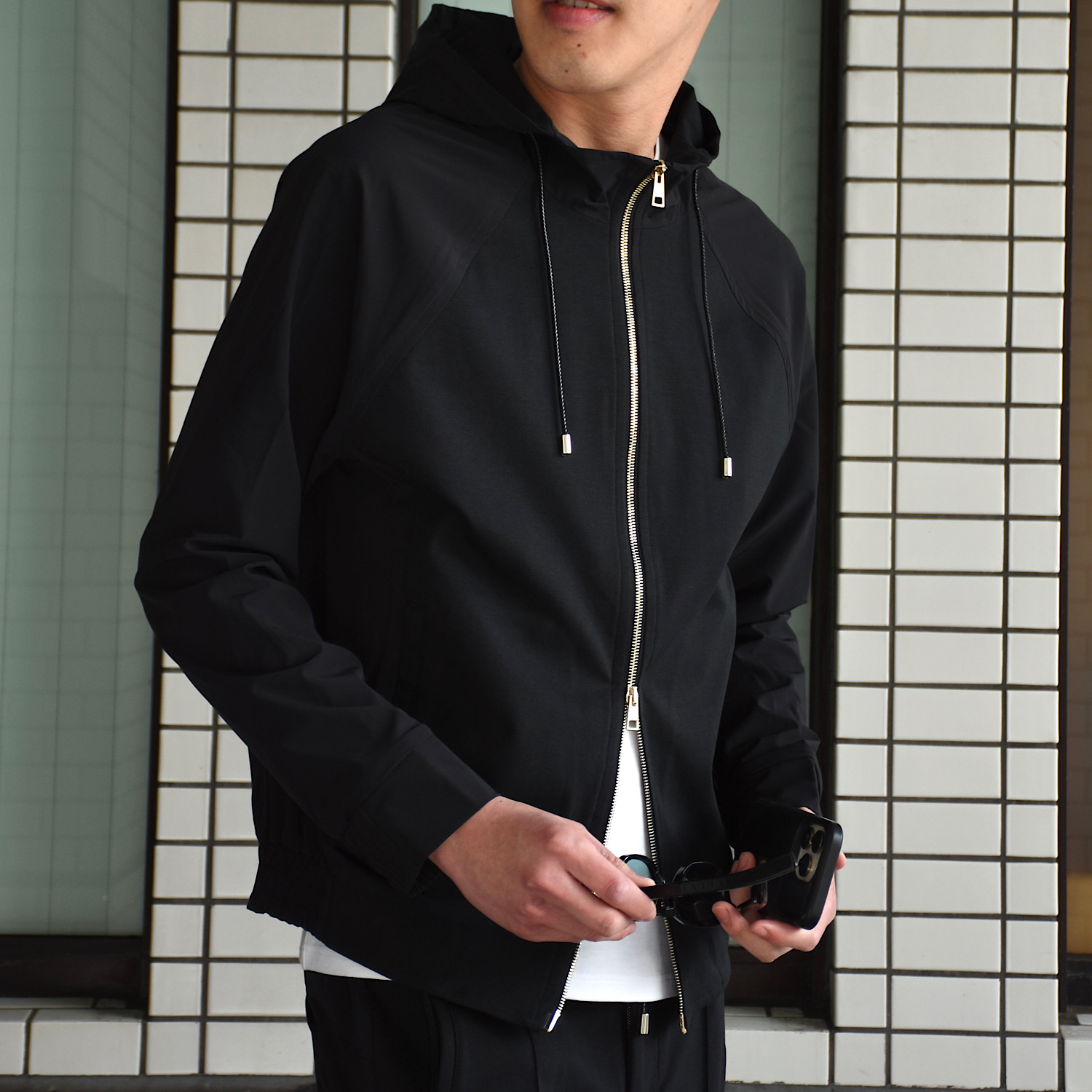 ・「giabsarchivio(ジャブスアルキヴィオ)」が誇るジャージー素材であるウォッシャブルジャージーとナイロン素材であるシャカヌメナイロンが組み合わされることで生まれるテック感が体感できる一着。