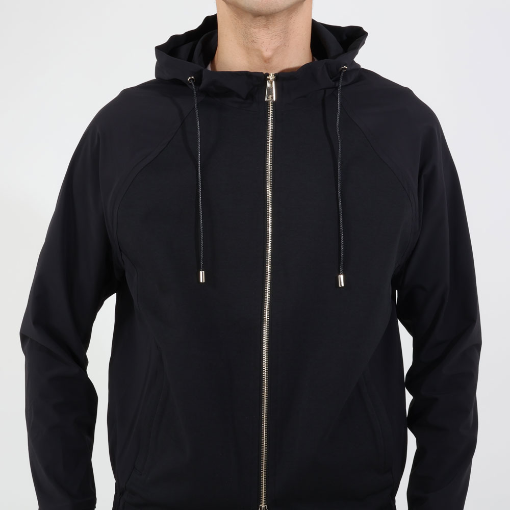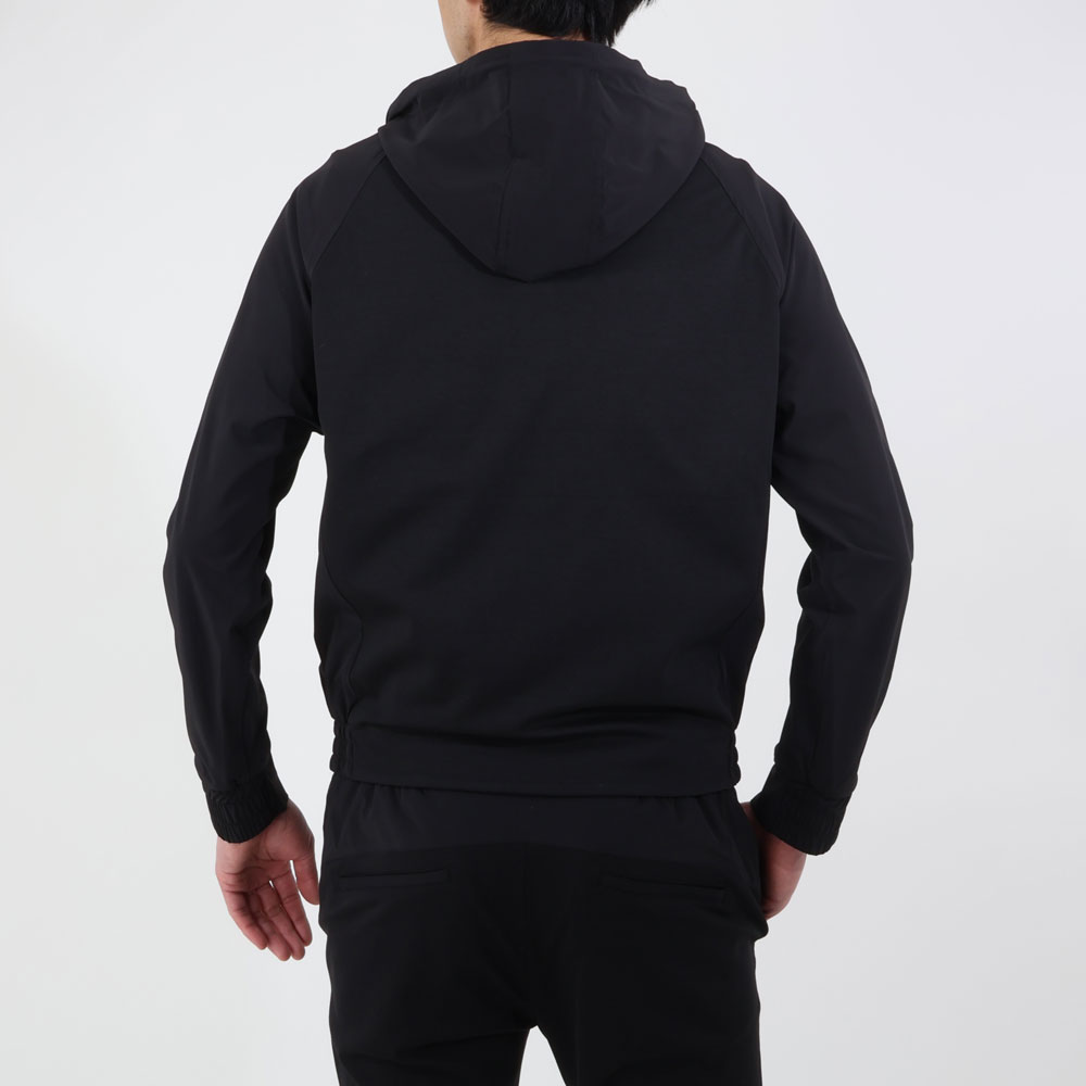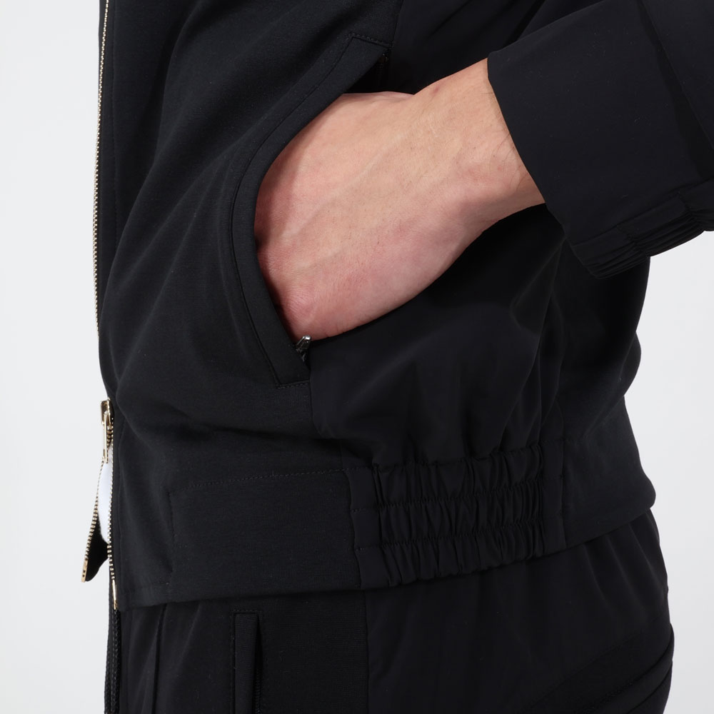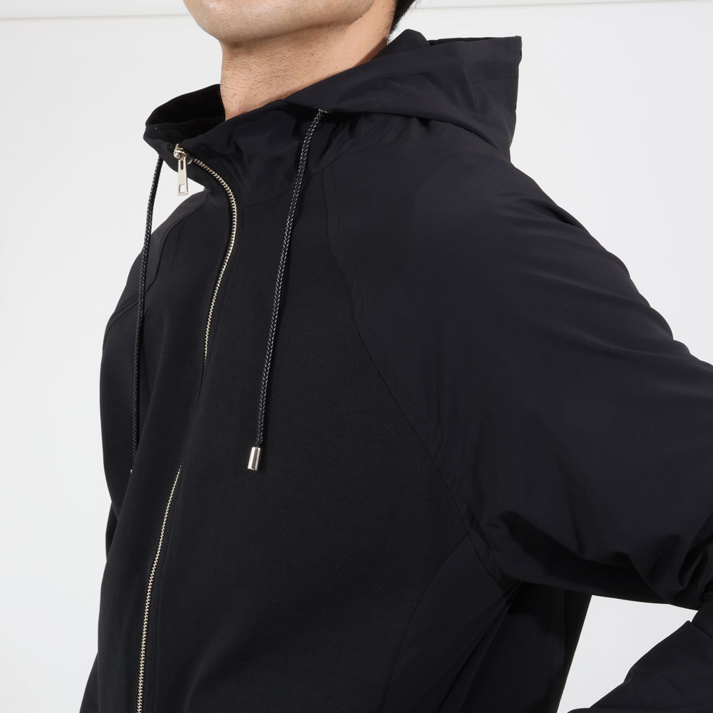 ・袖付けはラグラン、メッシュレザーのように見える高級感あるフードのドローコード、ZIP付きの腰ポケットとスポーティさとラグジュアリー感を薫らせながら、最大のポイントは異素材コンビであることです。