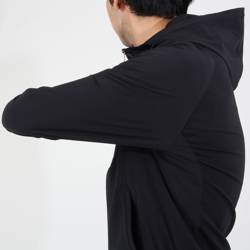 ・首周りには台が付くことでフードの立ち上がりが適度にあり、ジップを上まで留めた際に首元をカバーするのがアメリカブランドなどのパーカーとの違いです。洗練されたシルエットと素材使いが特徴。