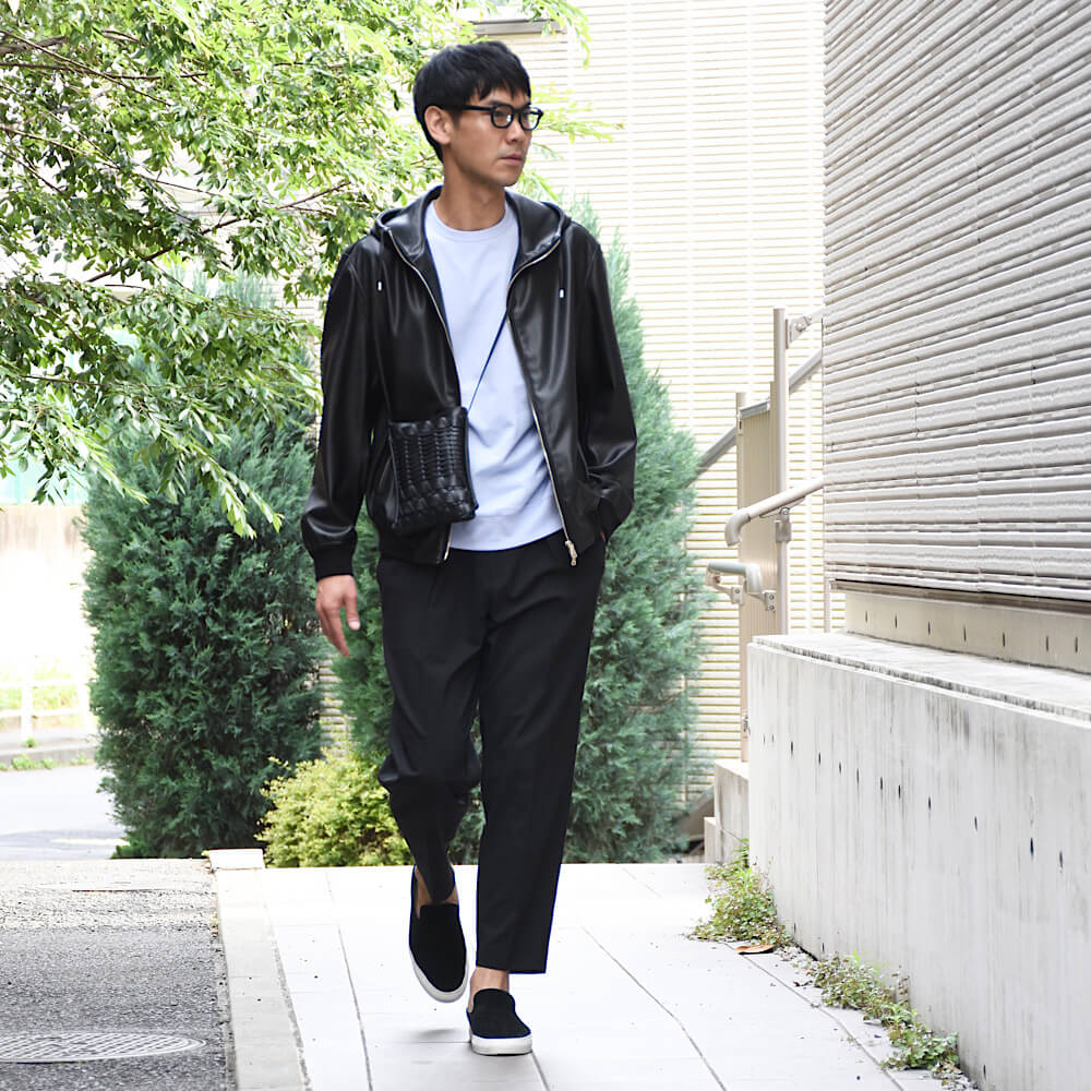 ・目を惹くのはレザーの編み込み部分。ハンドクラフト感はありつつも、モダンさのある仕上がりになっており、高級感を備えています。単なるデザインではなく外ポケットになっているため、出し入れの多いスマホにピッタリ。
