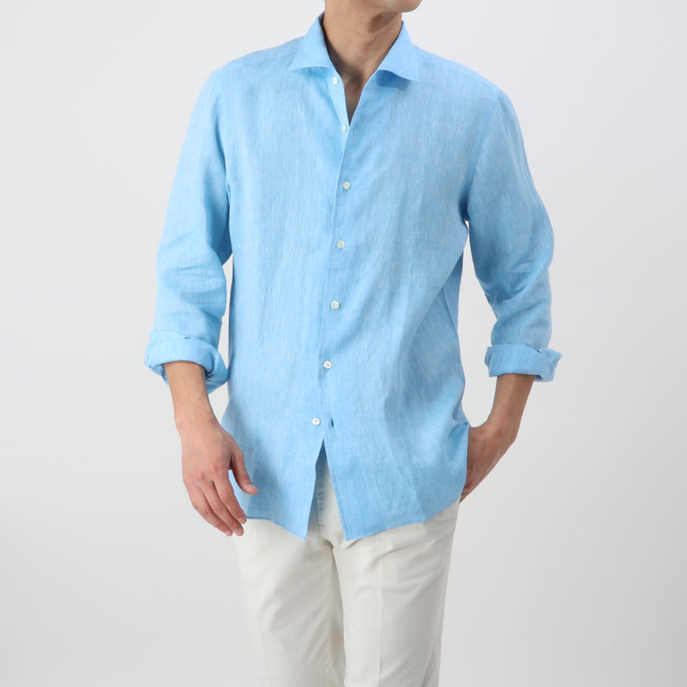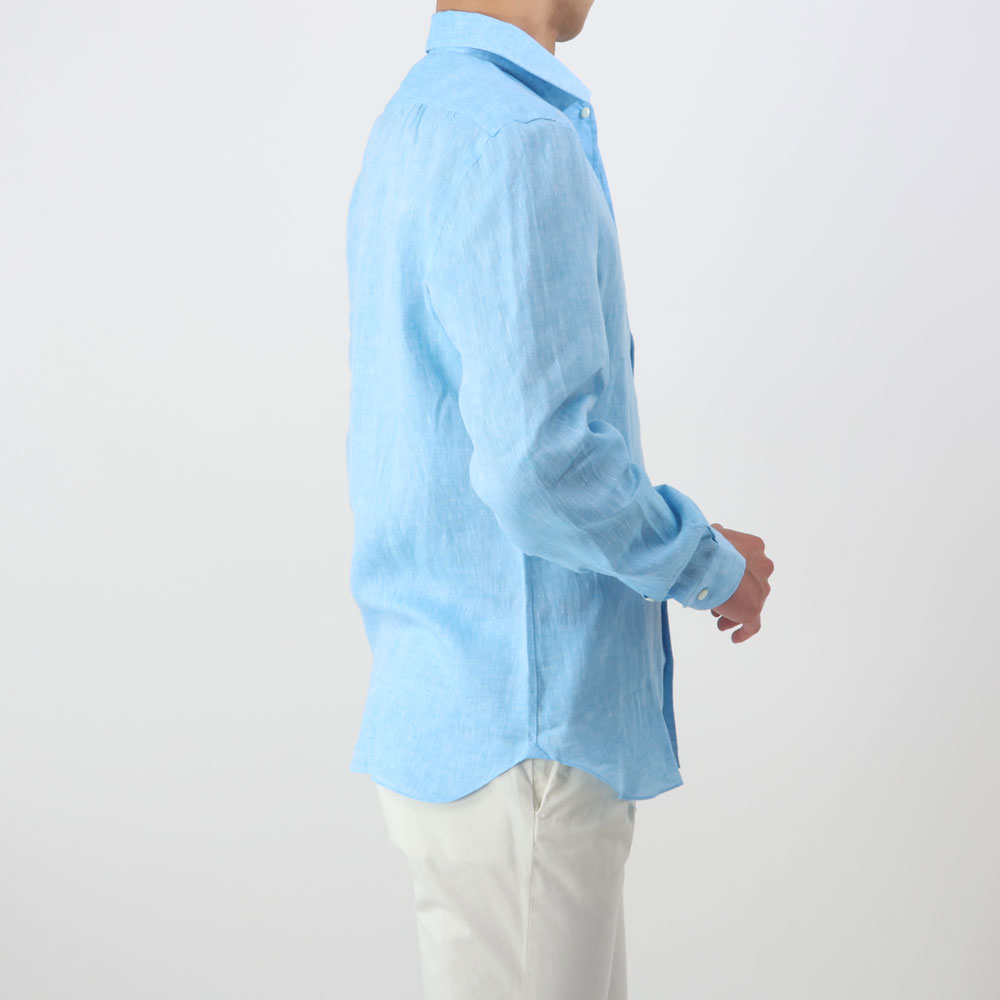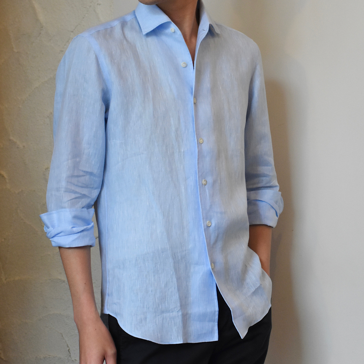 ・生地は春夏シーズン「Maria Santangelo(マリア・サンタンジェロ)」定番のリネン。ならではの清涼感あるドライなタッチは着込むほどに柔らかくなり、快適さが増します。生地の色によって白と黒の蝶貝ボタンを使い分けている点はBRのこだわり。全8色(グレー/ブラック/ブラウン、ホワイト/ラベンダー)をラインナップしました。