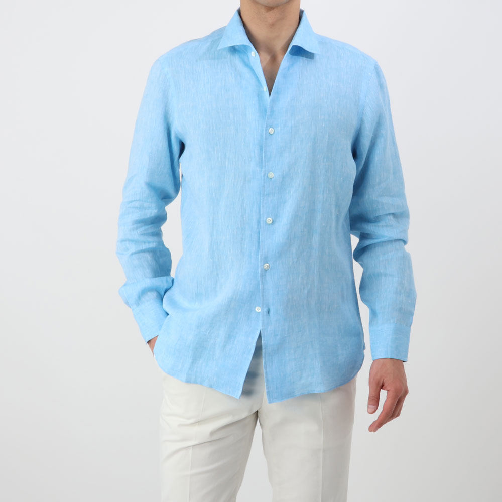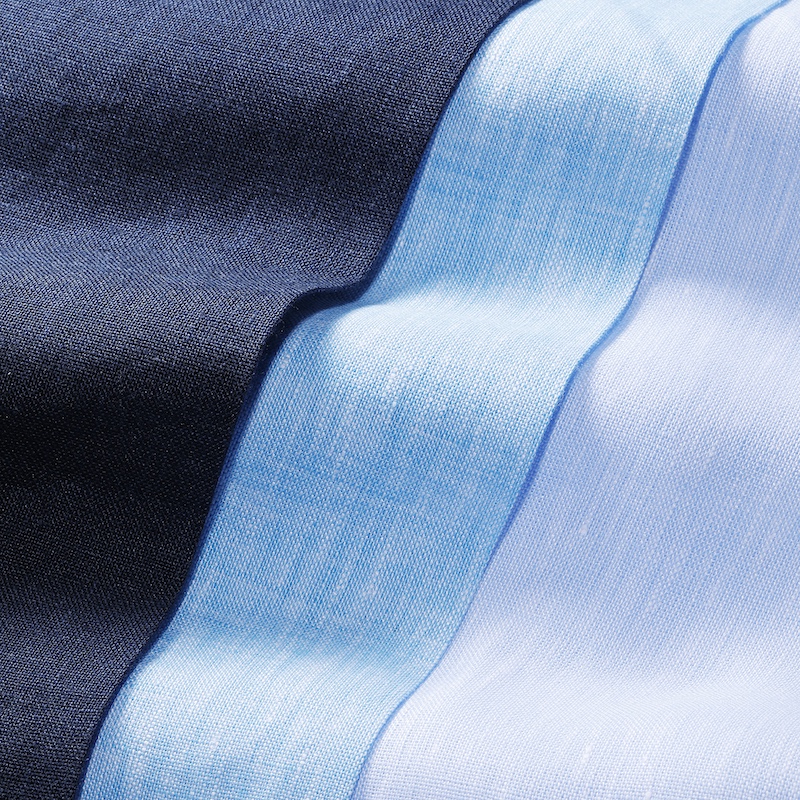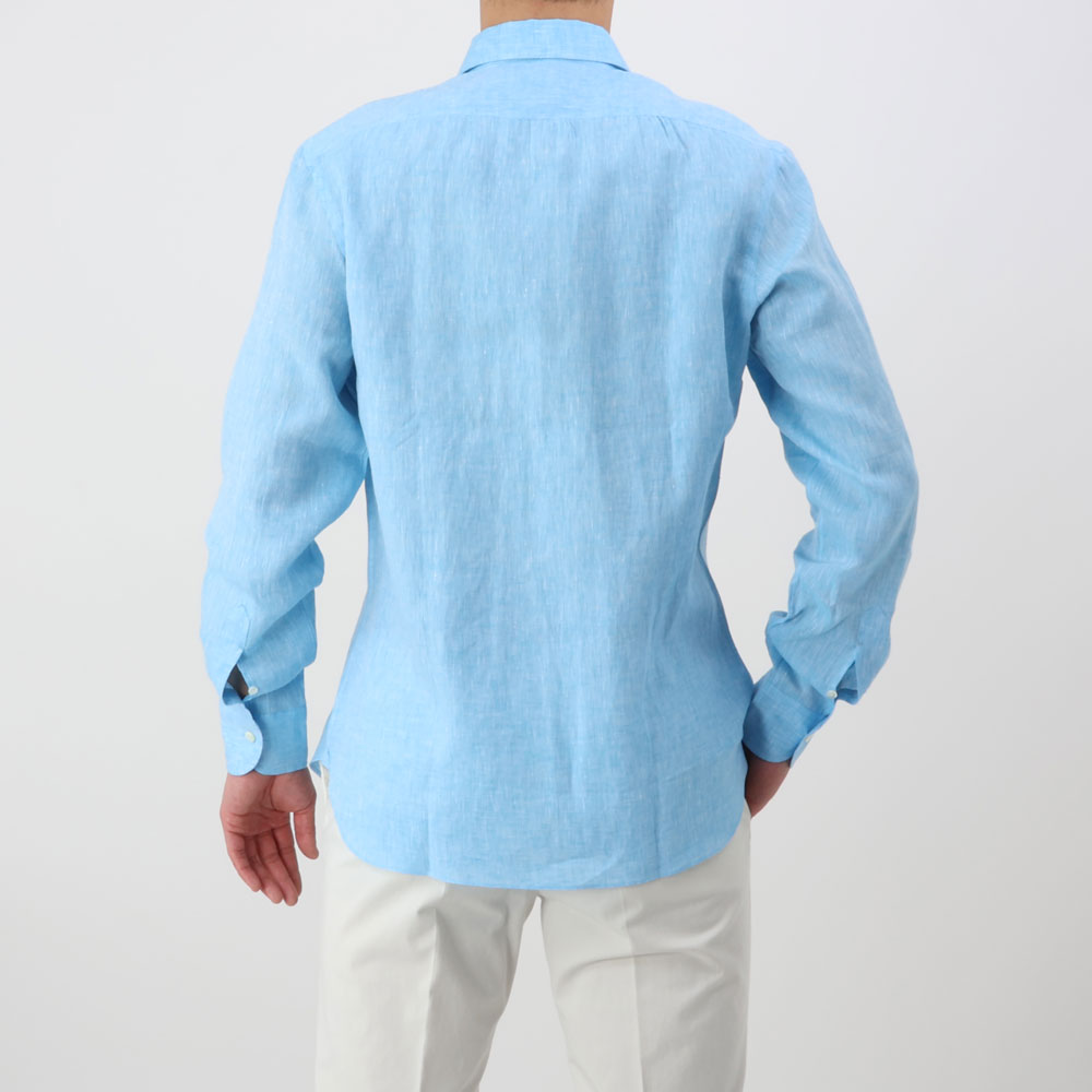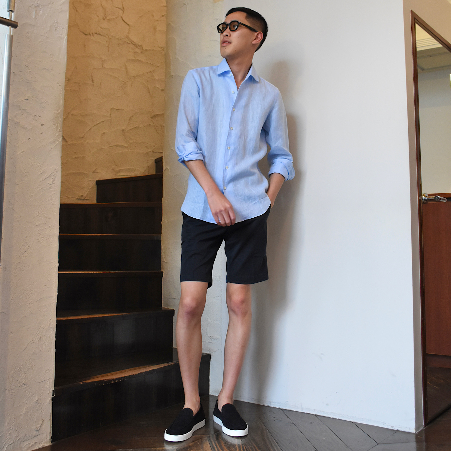 ・生地は春夏シーズン「Maria Santangelo(マリア・サンタンジェロ)」定番のリネン。ならではの清涼感あるドライなタッチは着込むほどに柔らかくなり、快適さが増します。生地の色によって白と黒の蝶貝ボタンを使い分けている点はBRのこだわり。全8色(グレー/ブラック/ブラウン、ホワイト/ラベンダー)をラインナップしました。