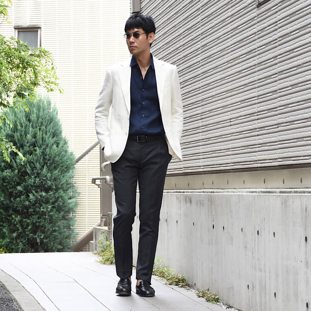 ・ワンピースカラーはボタンを開けて着た際に胸元からの曲線が美しく繋がり実にエレガント。また、ボタンを留めてタイドアップをした際には襟元が少し下がって見えてほんのりリラックス感を演出できます。ゆえに、ニットタイもしくはリネンやコットンがブレンドされたカジュアルな雰囲気のタイが良く合います。