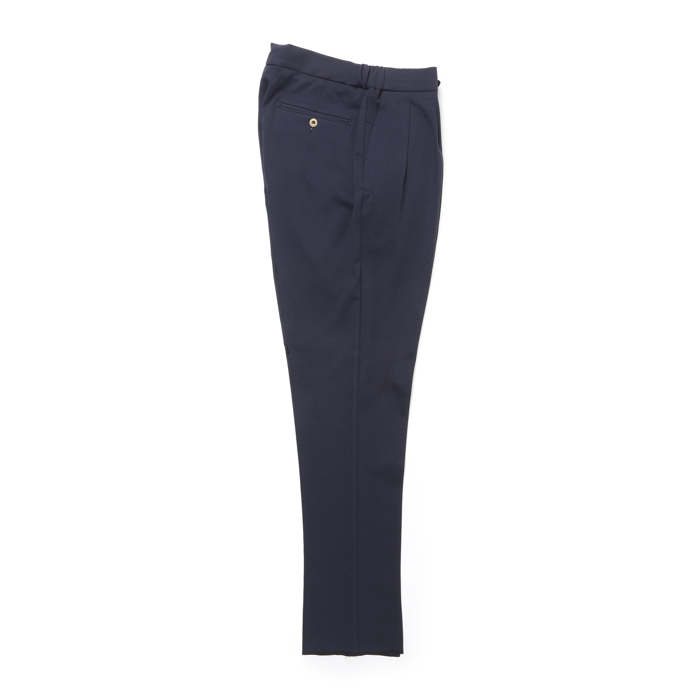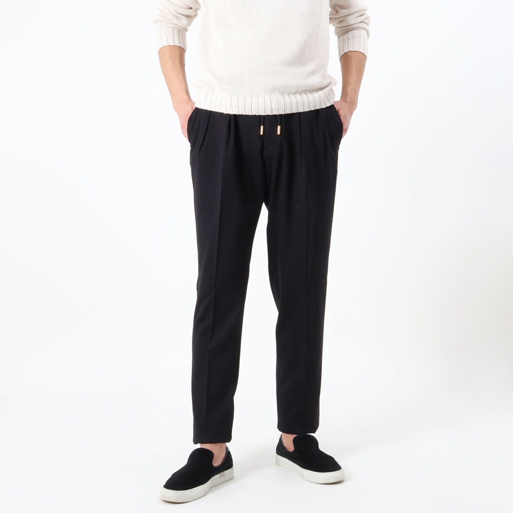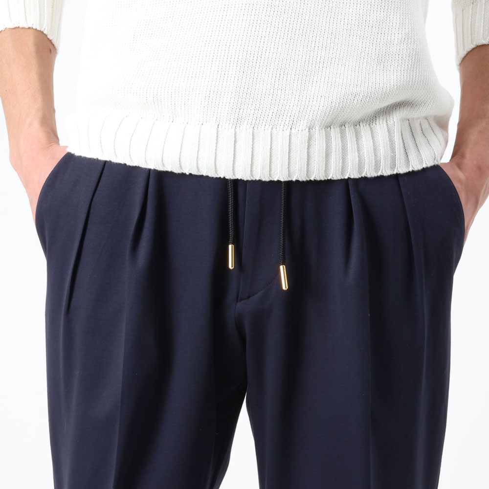 • ゴールドパーツ、2プリーツ、ウエストサイドゴムシャーリング&ドローコード付き、前ポケット×3、後ポケット×2、フロントジップ、裾口アンフィニッシュ