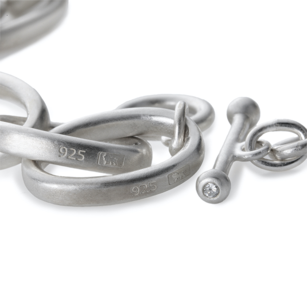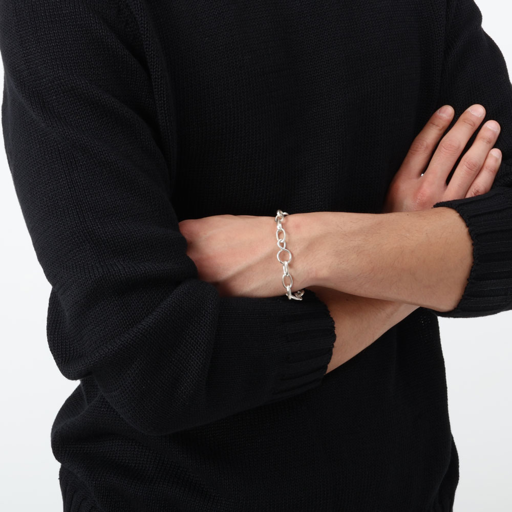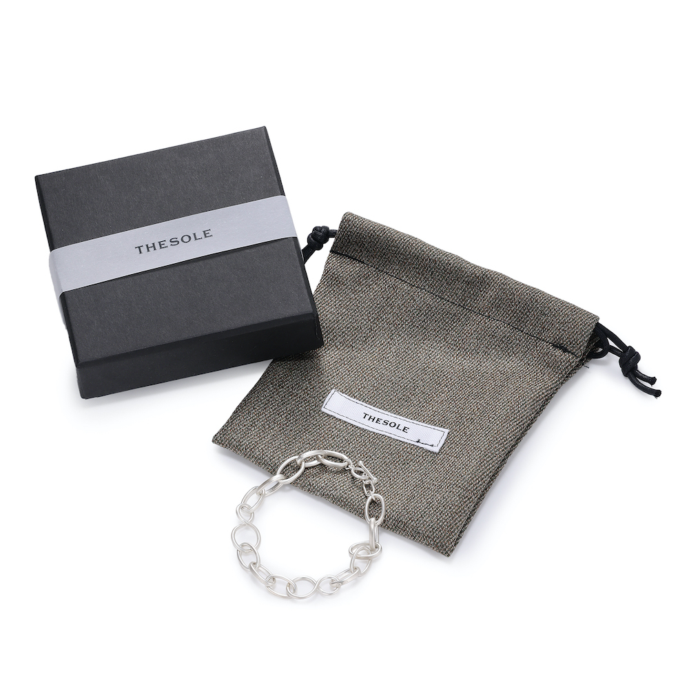 ・光沢が抑えられたホワイトシルバーのような色合い、程よい線径のリング状パーツが繋ぎ合わされたブレスレットは、英国のアンティークシルバーチェーンがモチーフとなっています。どことなく品の良さを醸すのはその出自、そして作りと素材の良さゆえ。
