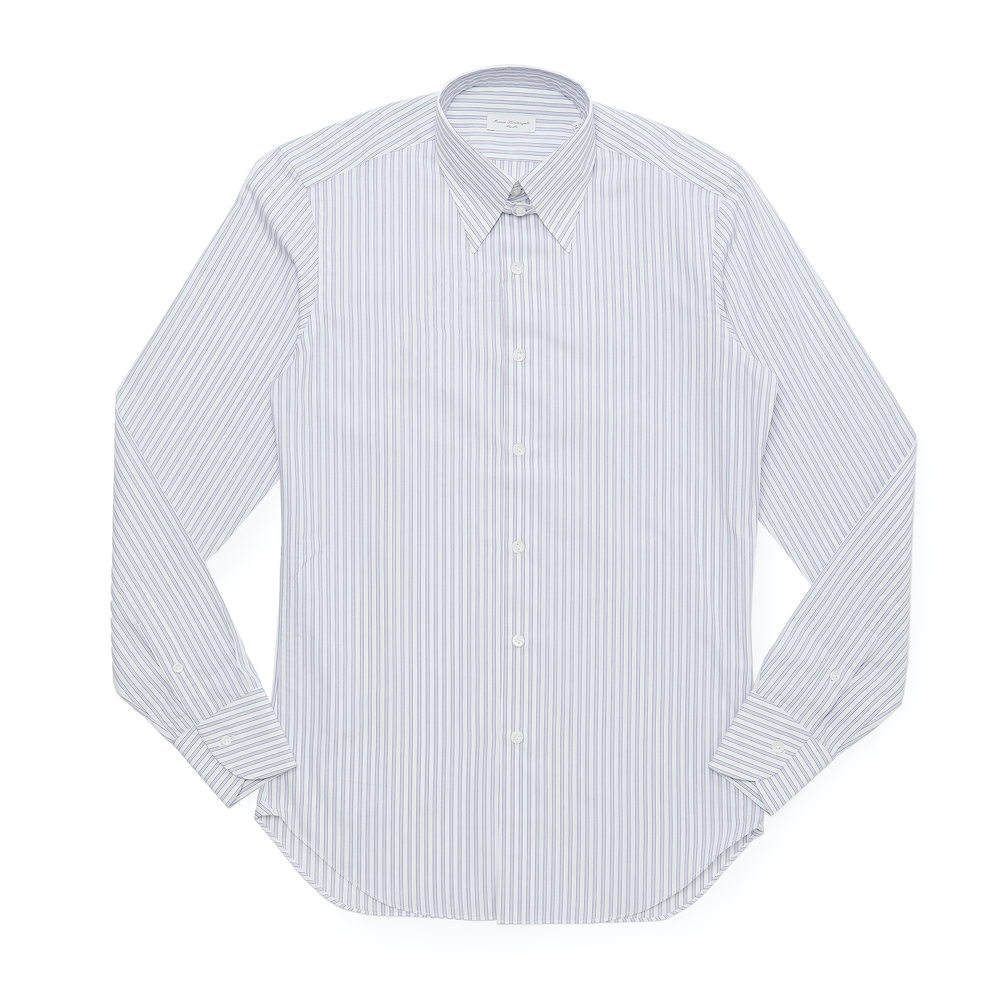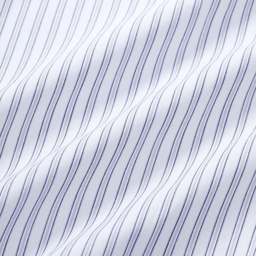・生地は通年着られる平織りのマルチストライプ。白をベースにブルー系とラベンダーのストライプを効かせています。