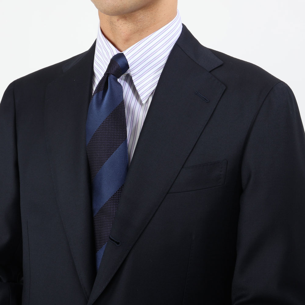・色の配分として白の分量が多く、ストライプ幅はやや細め、という柄行き。ソリッドタイを締めればさりげなく華やかさのあるVゾーンが簡単に完成します。