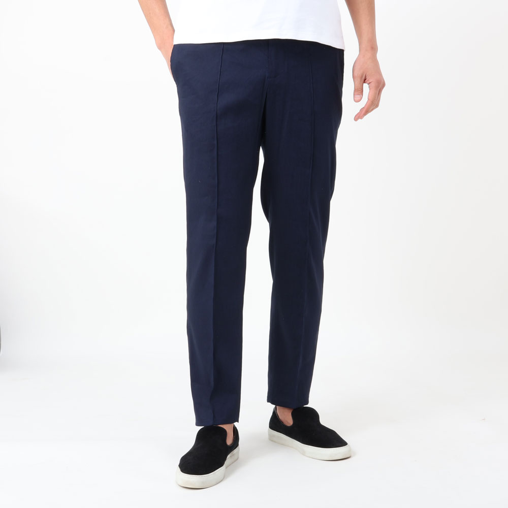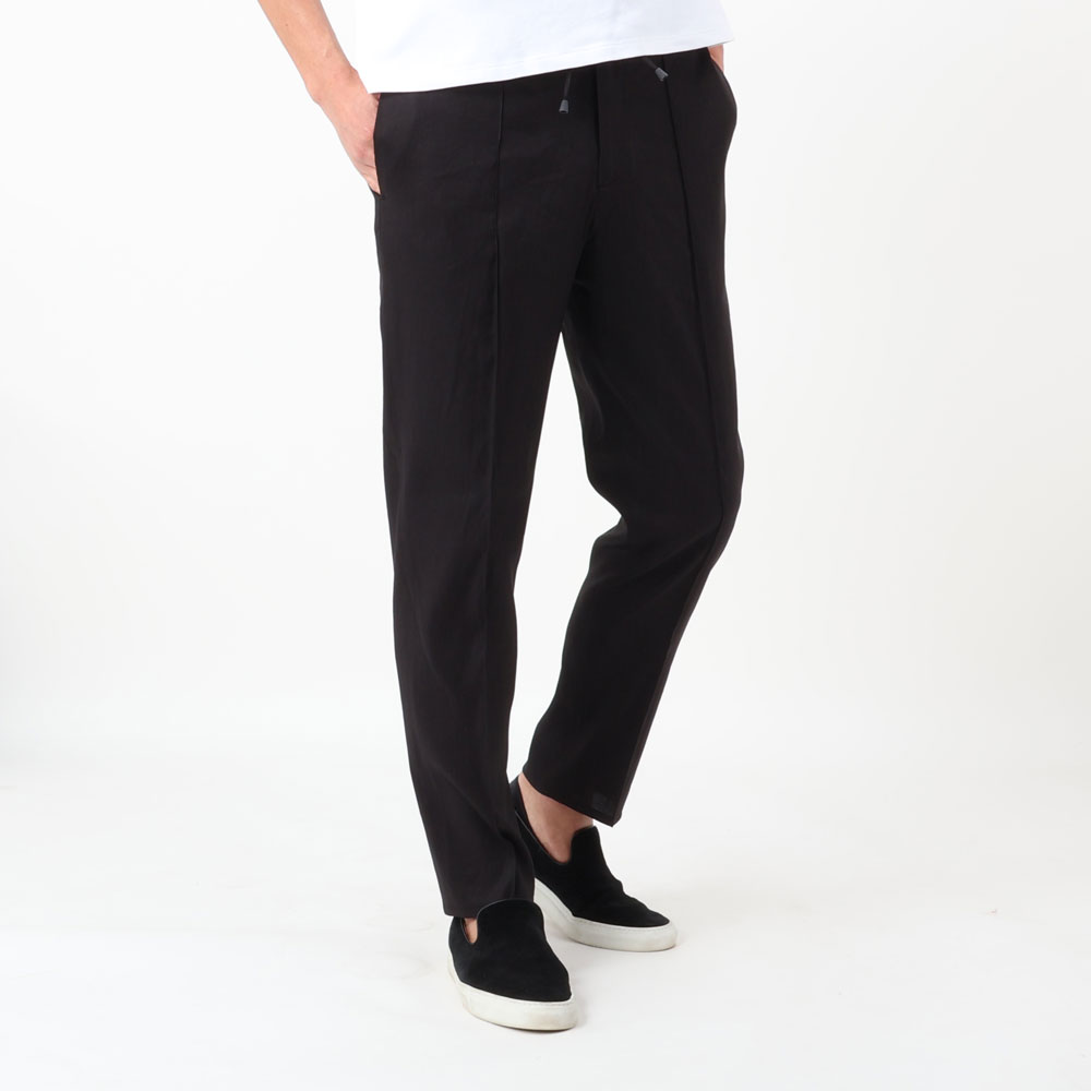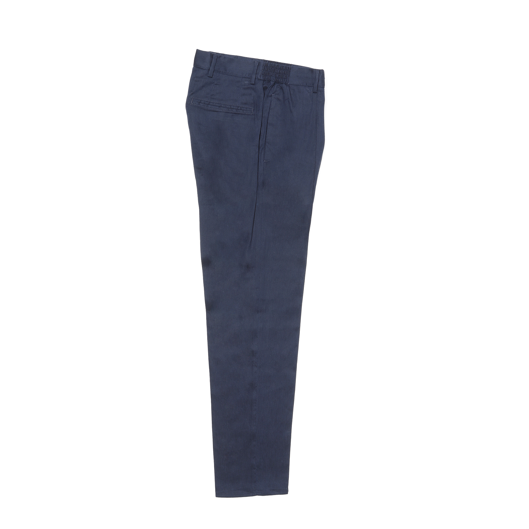 • フロントジップアップ、1プリーツ、ウエストサイドシャーリングゴム&ドローコード付き、永久クリース、裾口タタキ仕上げ(幅1cm)