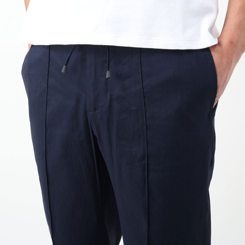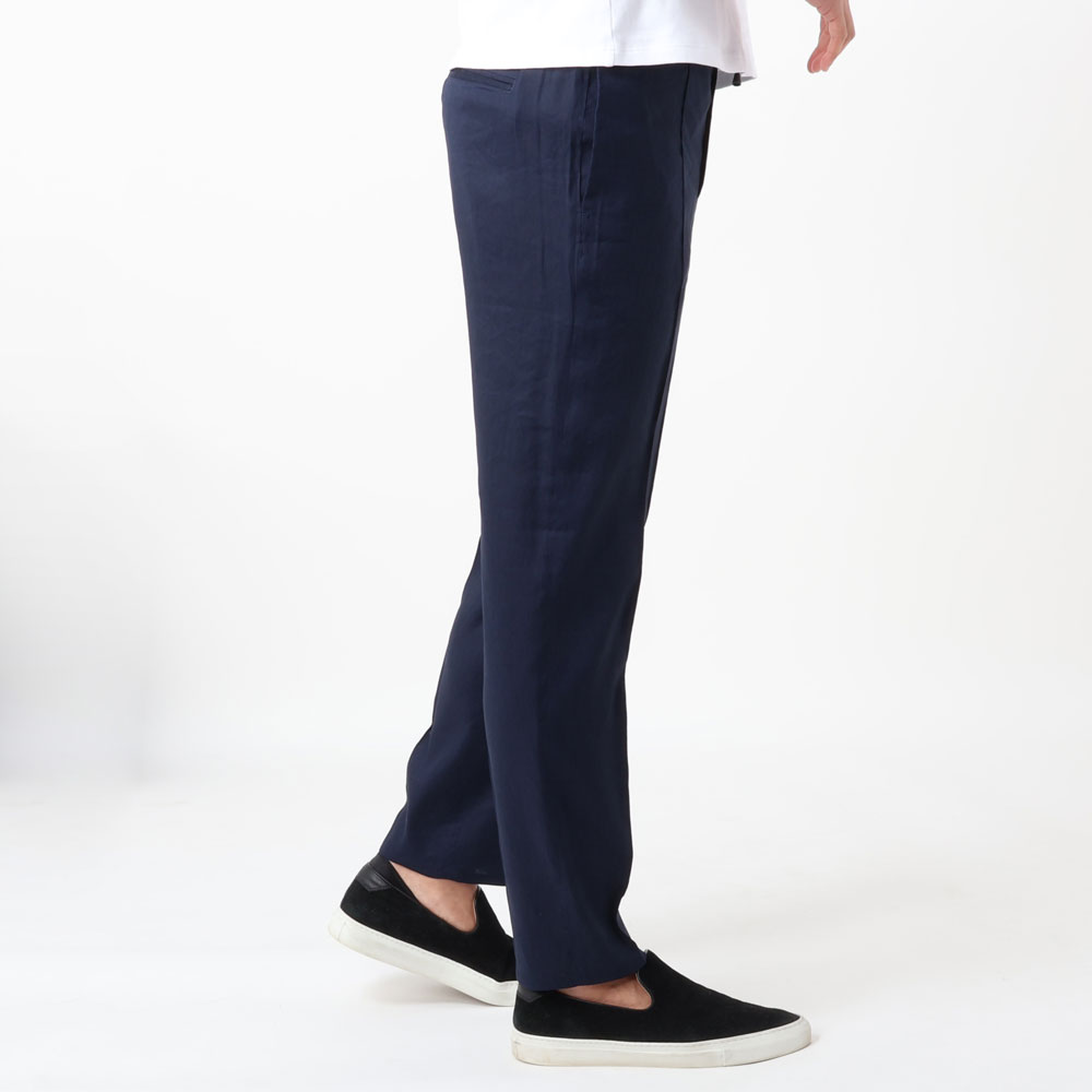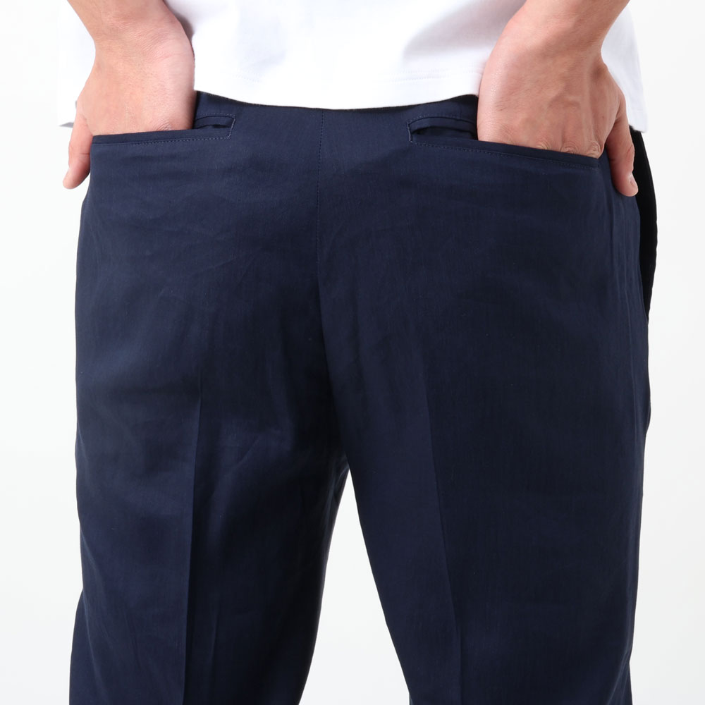 ・リネンならではの風合い感が楽しめつつシャリ感は控えめ。シルキータッチのようなほんのりとろみがかったサラリと柔らかな生地感。軽量且つストレッチ性もありラクな穿き心地です。