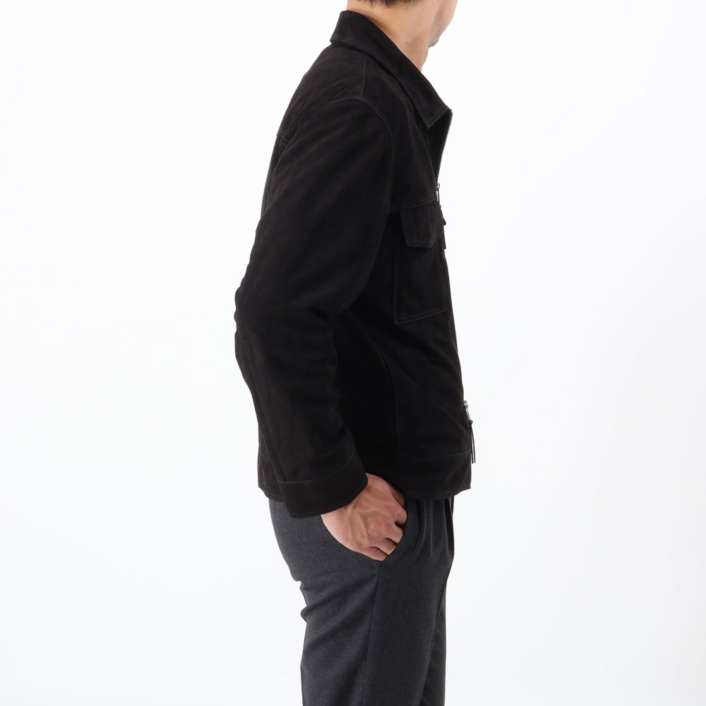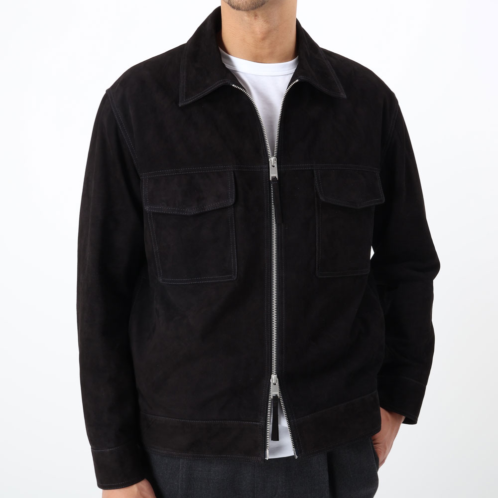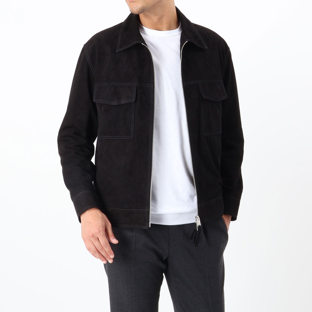 ・インターナショナルなフィッティングで適度なゆとりを感じさせる肩幅とボディ、ちょうどいい着丈設定、と粗野に見えがちなスウェードブルゾンが洗練されて映るバランスに仕上げられています。