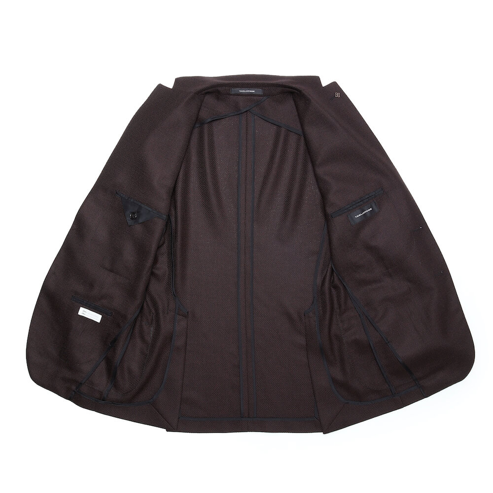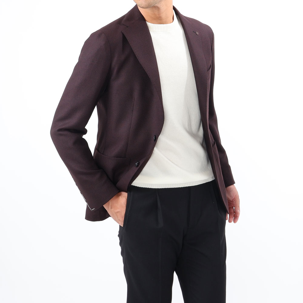 ・モデルは「TAGLIATORE(タリアトーレ)」が誇る軽量仕立ての"DAKAR"。形状保持とボリューム感を出すためにジャケットのキモとも言える襟、肩、バスト部分以外は一枚仕立てで、ジャケットという概念を裏切るほどの極めて軽い着心地が特徴です。