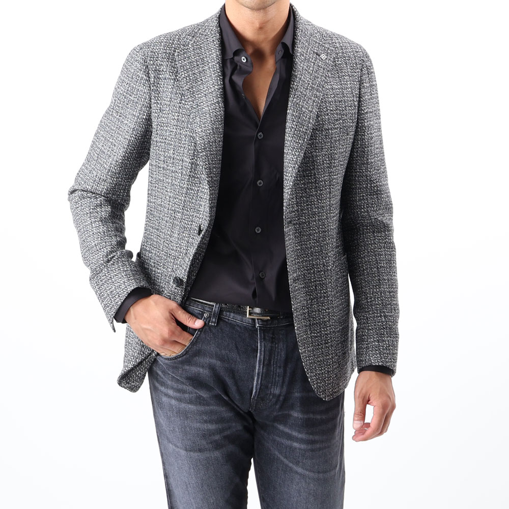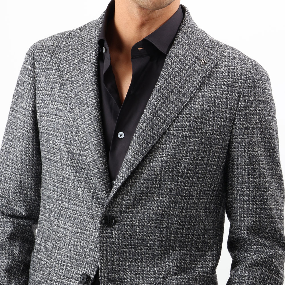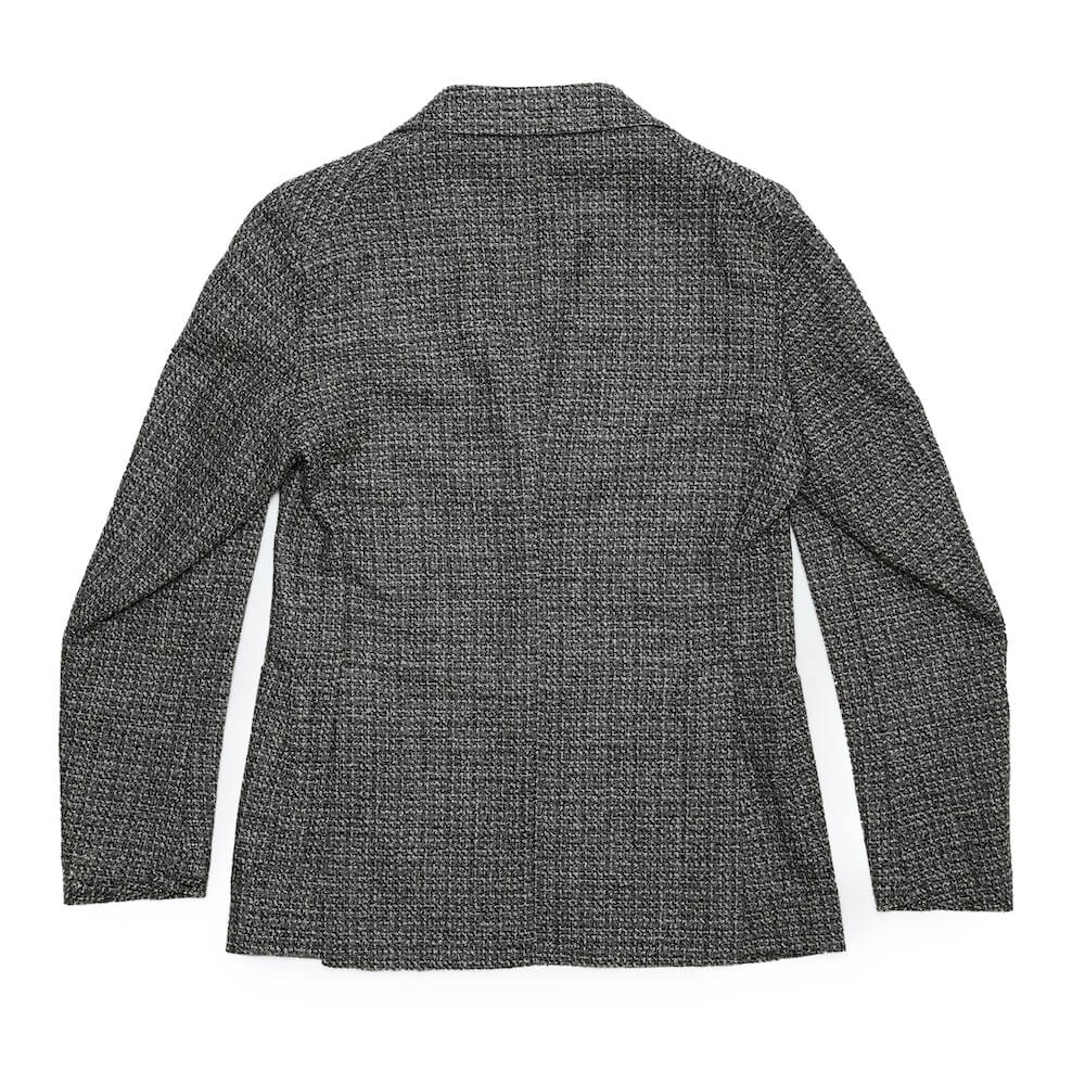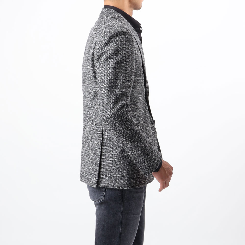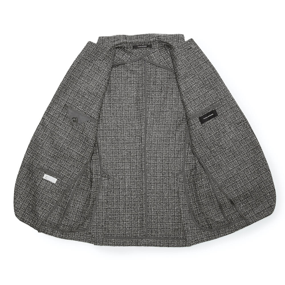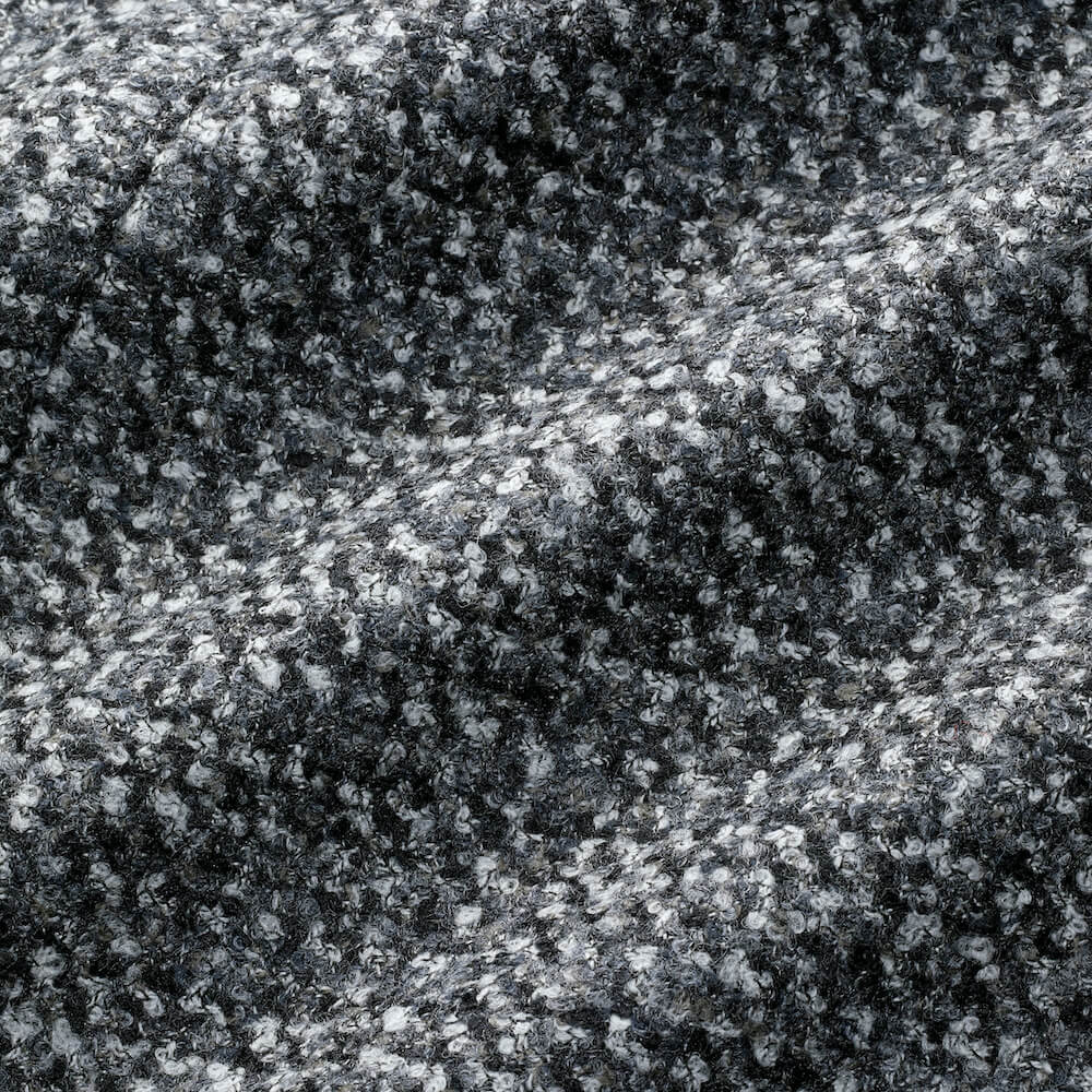 ・都会的なモノトーン配色でまとめられたブークレ調生地は、ウールにポリエステルがブレンドされたもの。モノトーンでも単調に見えないのはブークレの織り感があるから。柄や色合いの奥行きが楽しめる一着です。目付けは340グラム。