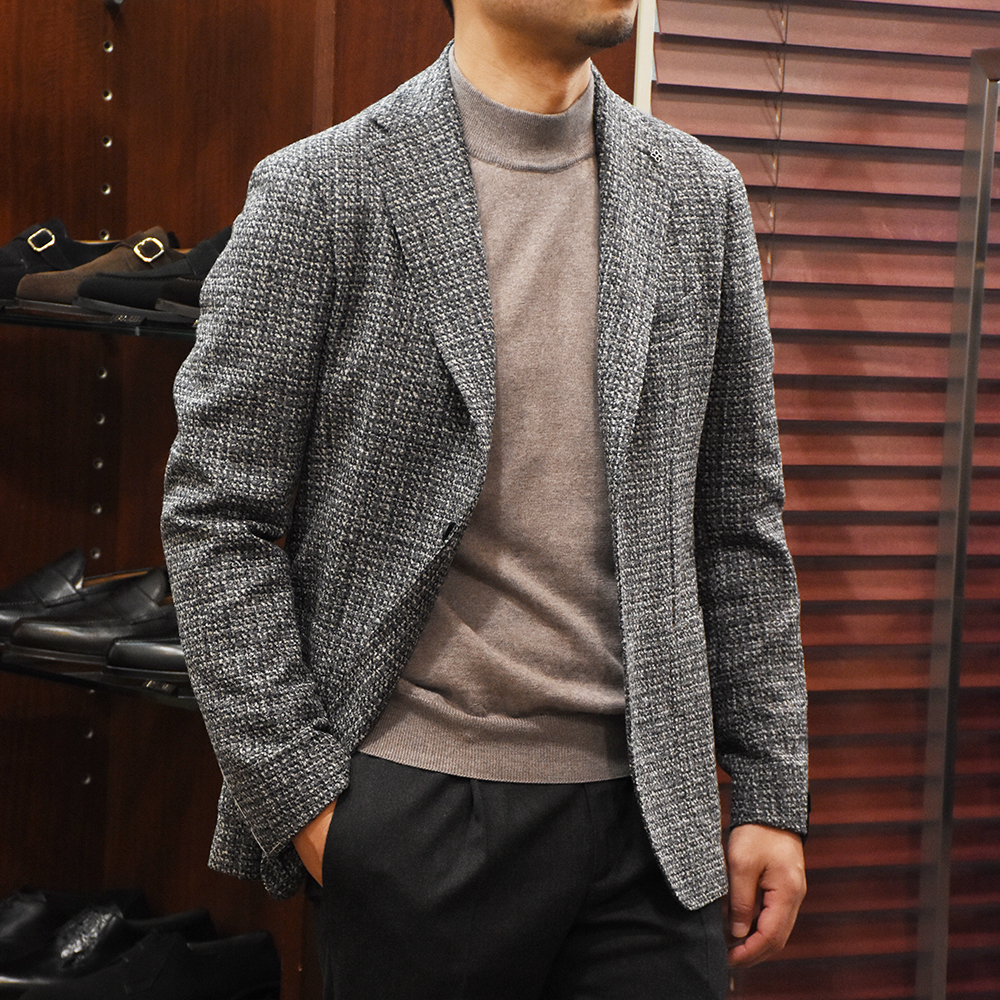 メランジの配色や表情が絶妙なのかどことなくモードっぽい雰囲気が感じとれ、個人的には夜にジャズを聴きに行く際に洒落込んで着たい一着です。