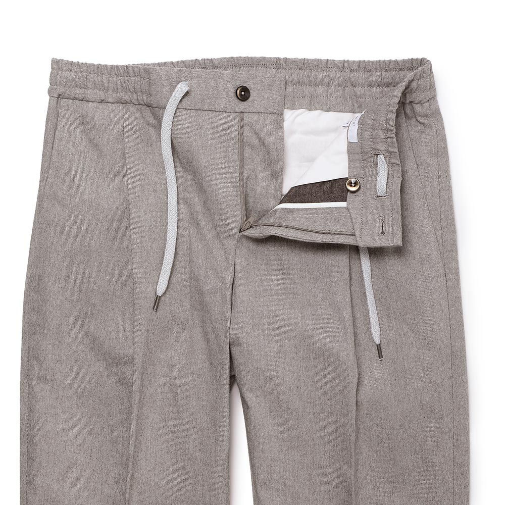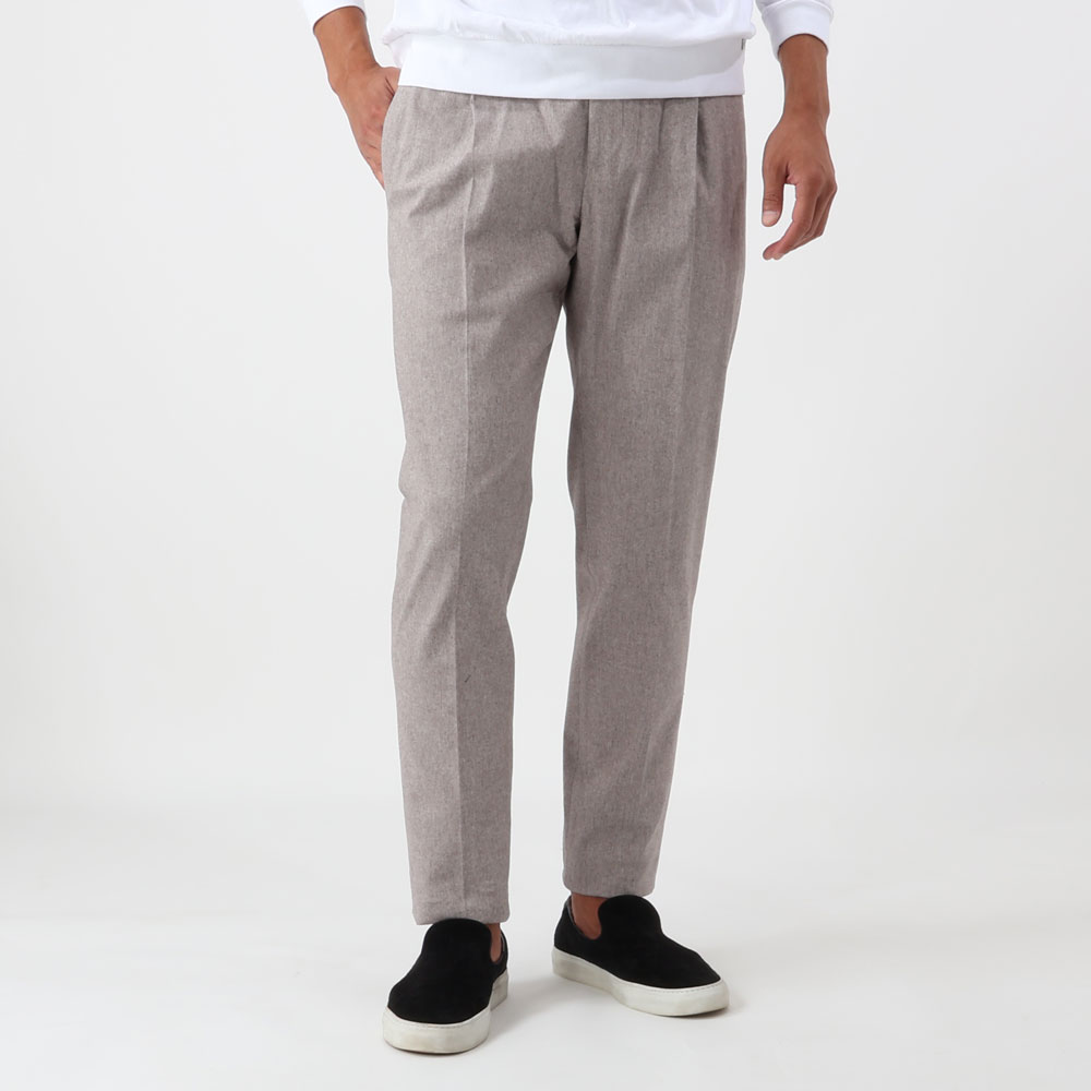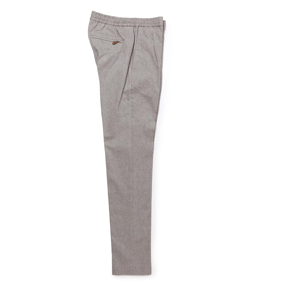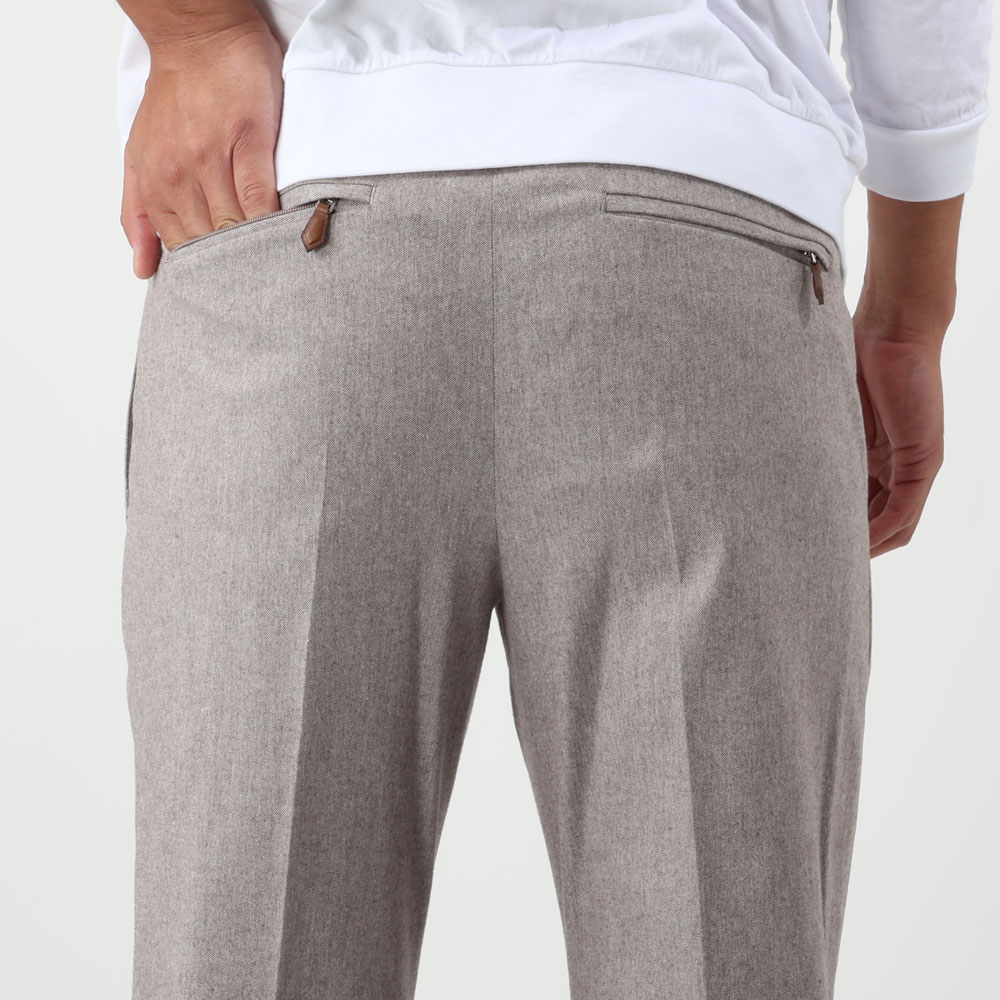 ・ウエストフルシャーリングでドローコード付き、1プリーツが入れられ運動量も確保された腰廻りが特徴のこちらは、快適な穿き心地と上品なルックスを追求した一本。ドローコードは内通しも可能、後ろポケットはZIP付きとディテールまで抜かりはありません。