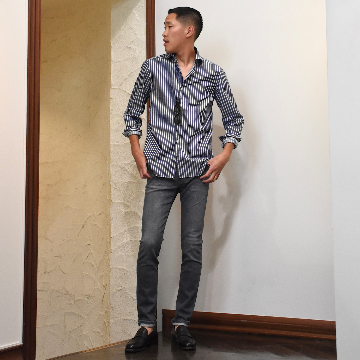 丈感はノークッションからワンクッションがオススメ。古く見えないようにトップスを少し緩めにし、上下コントラストを付けた着こなしが◎