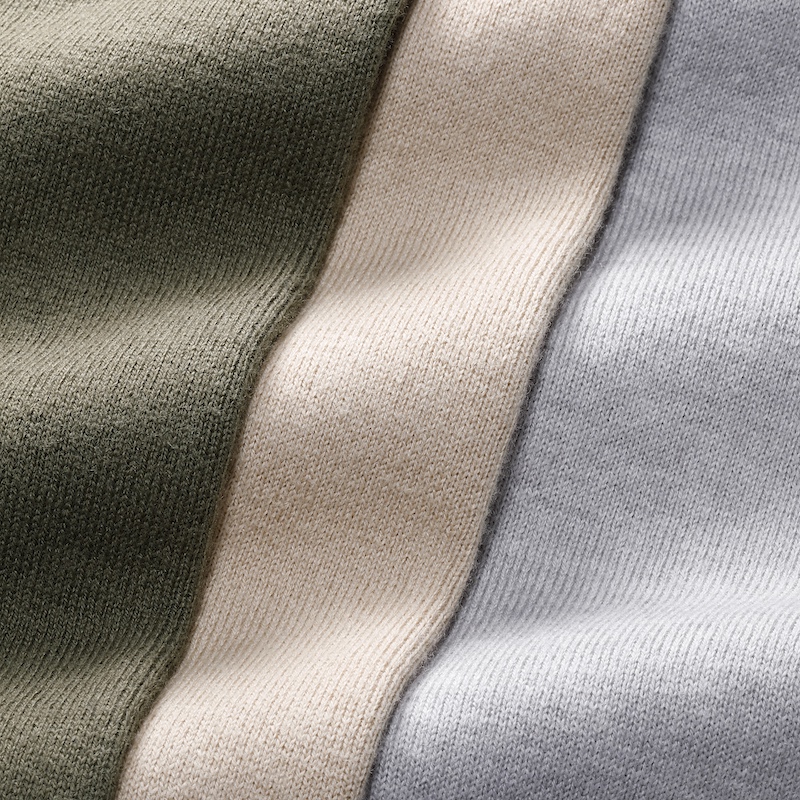 ・細番手のカシミア混の糸をしっかりと詰めて編み上げた目面の綺麗さ、柔らかな手触り、ストレッチの効いた弾力性がこの編み地の特徴です。