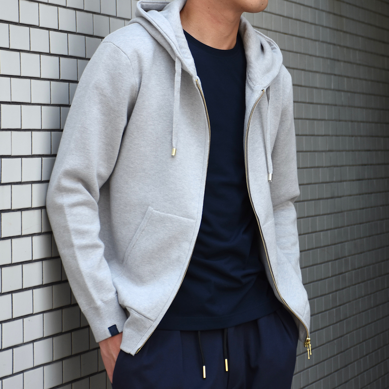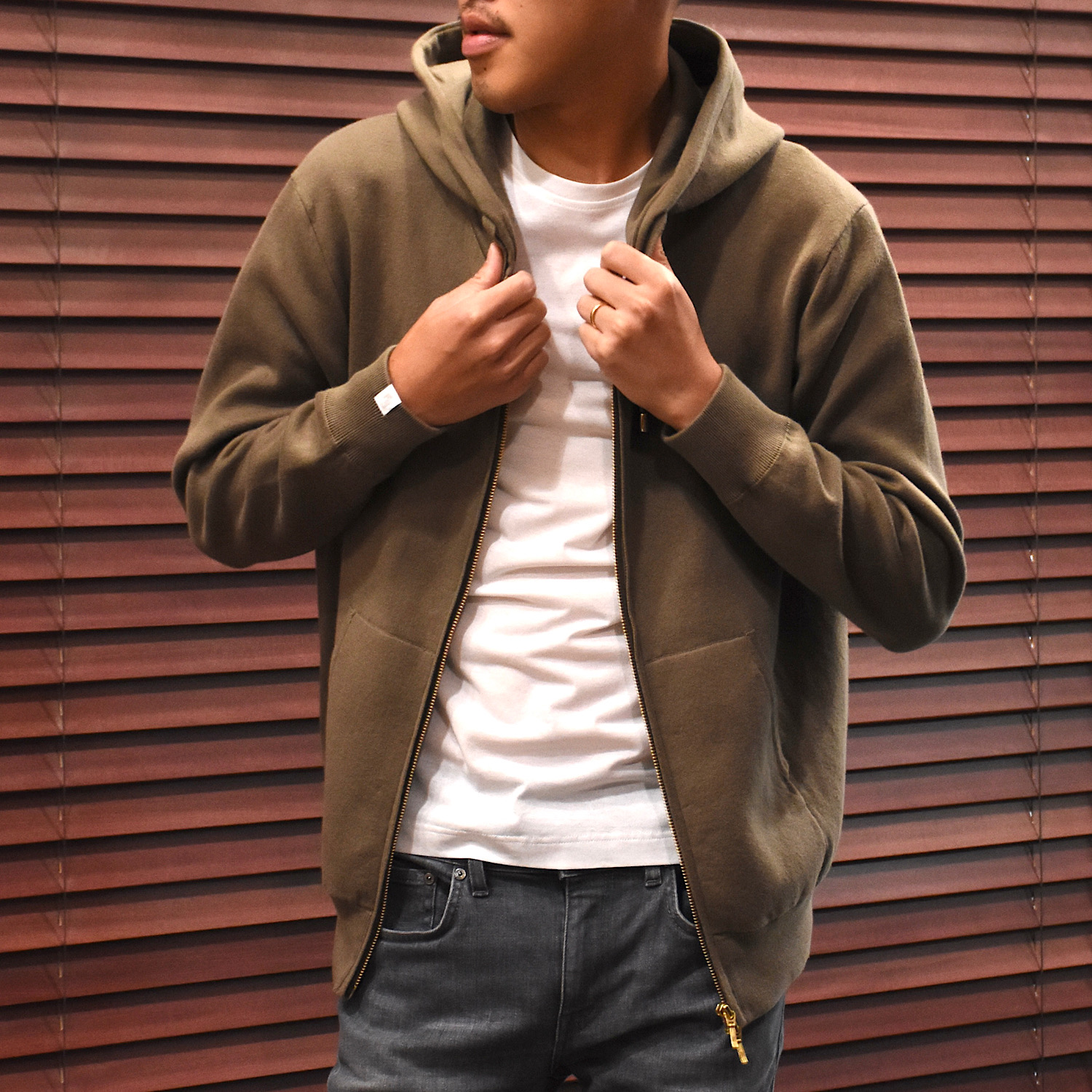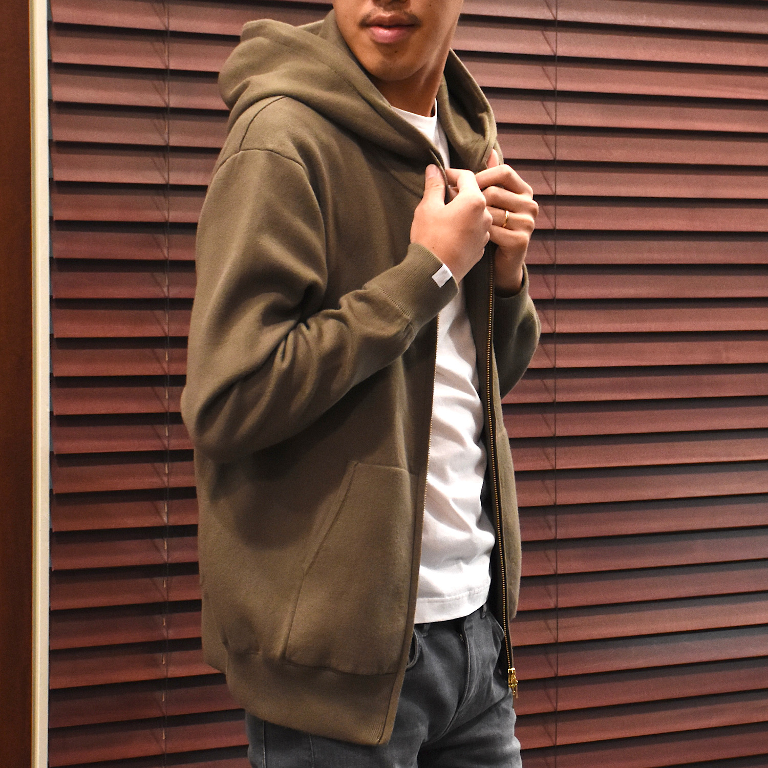 ・プルオーバーと同じイメージのシルエットを踏襲しつつも、ジップアップで前が開くという点を考慮し、身幅を細く着丈も短く、といった若干のモディファイをすることで、前開きで着た際にルーズに見えないバランスに仕上げています。