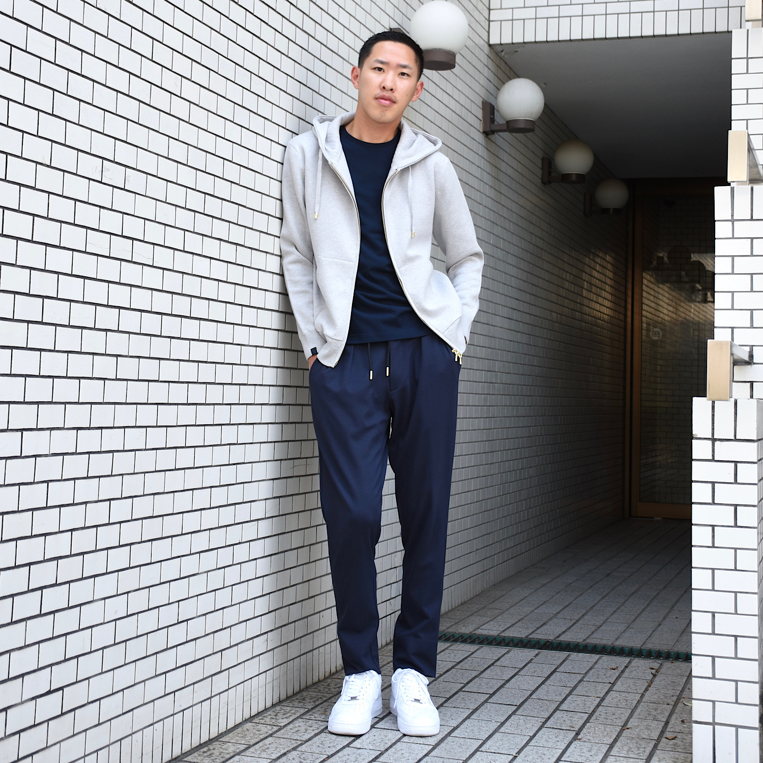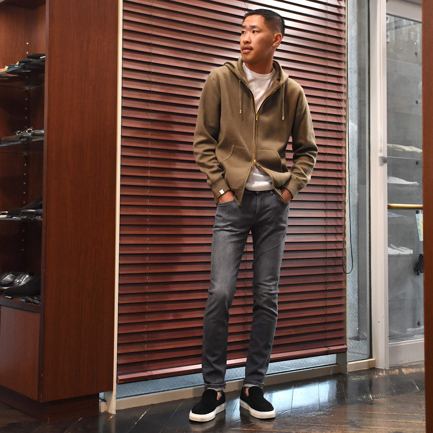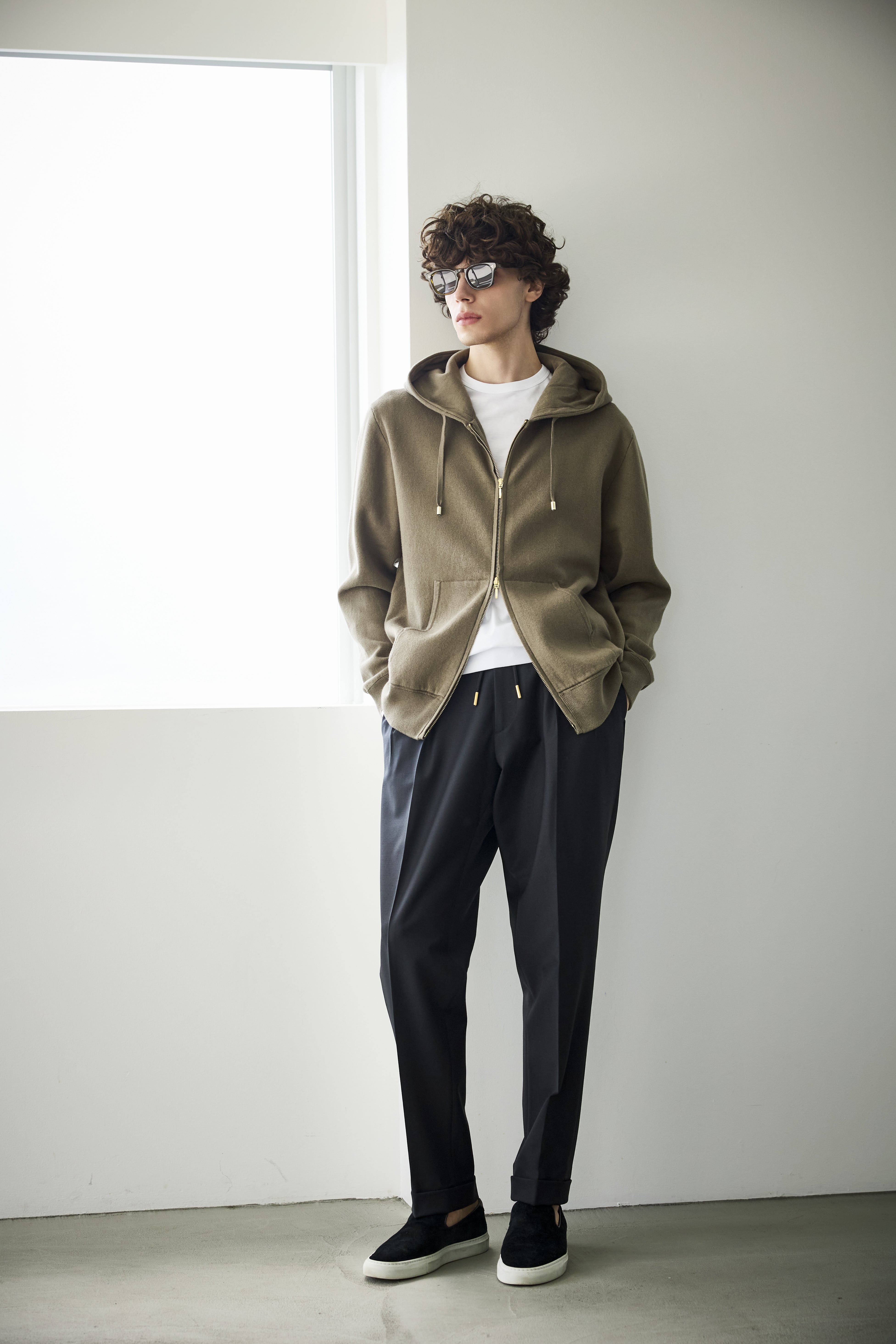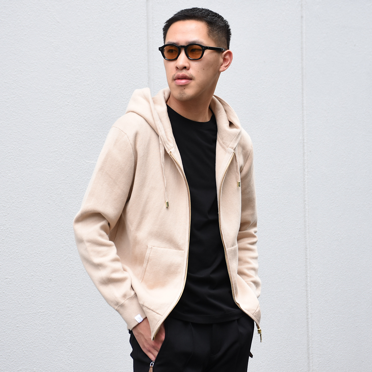 ・プルオーバーと同じイメージのシルエットを踏襲しつつも、ジップアップで前が開くという点を考慮し、身幅を細く着丈も短く、といった若干のモディファイをすることで、前開きで着た際にルーズに見えないバランスに仕上げています。