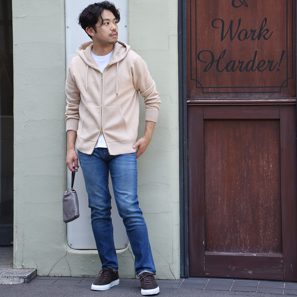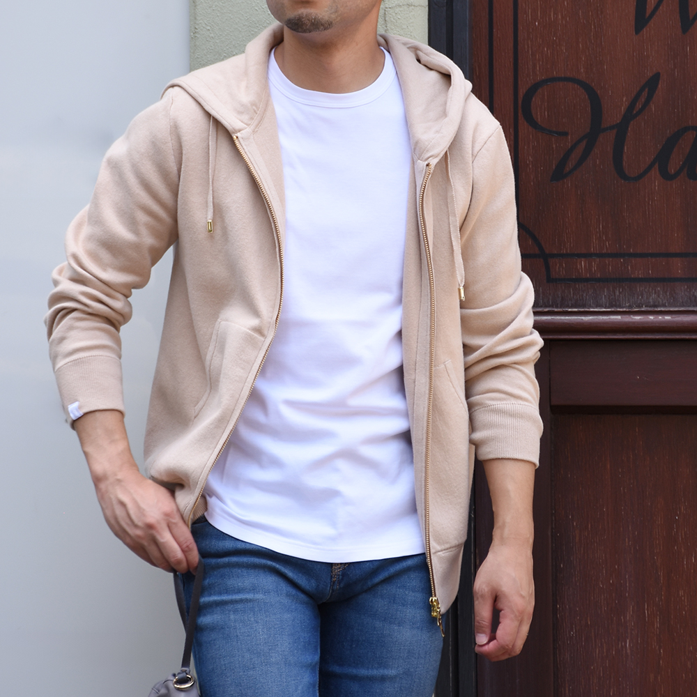 ・コットン75%とカシミア15%の風合いの良さは着用を重ねるごとに深まり(肌に触れる部分にナイロンは混紡されていません)、ご家庭での洗濯(手洗い)が可能な型崩れしにくい編み地です。