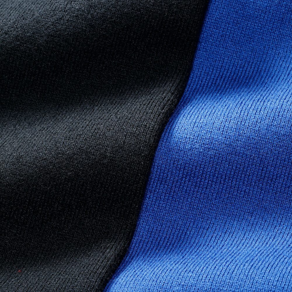 ・細番手のカシミア混の糸をしっかりと詰めて編み上げた目面の綺麗さ、柔らかな手触り、ストレッチの効いた弾力性がこの編み地の特徴です。
